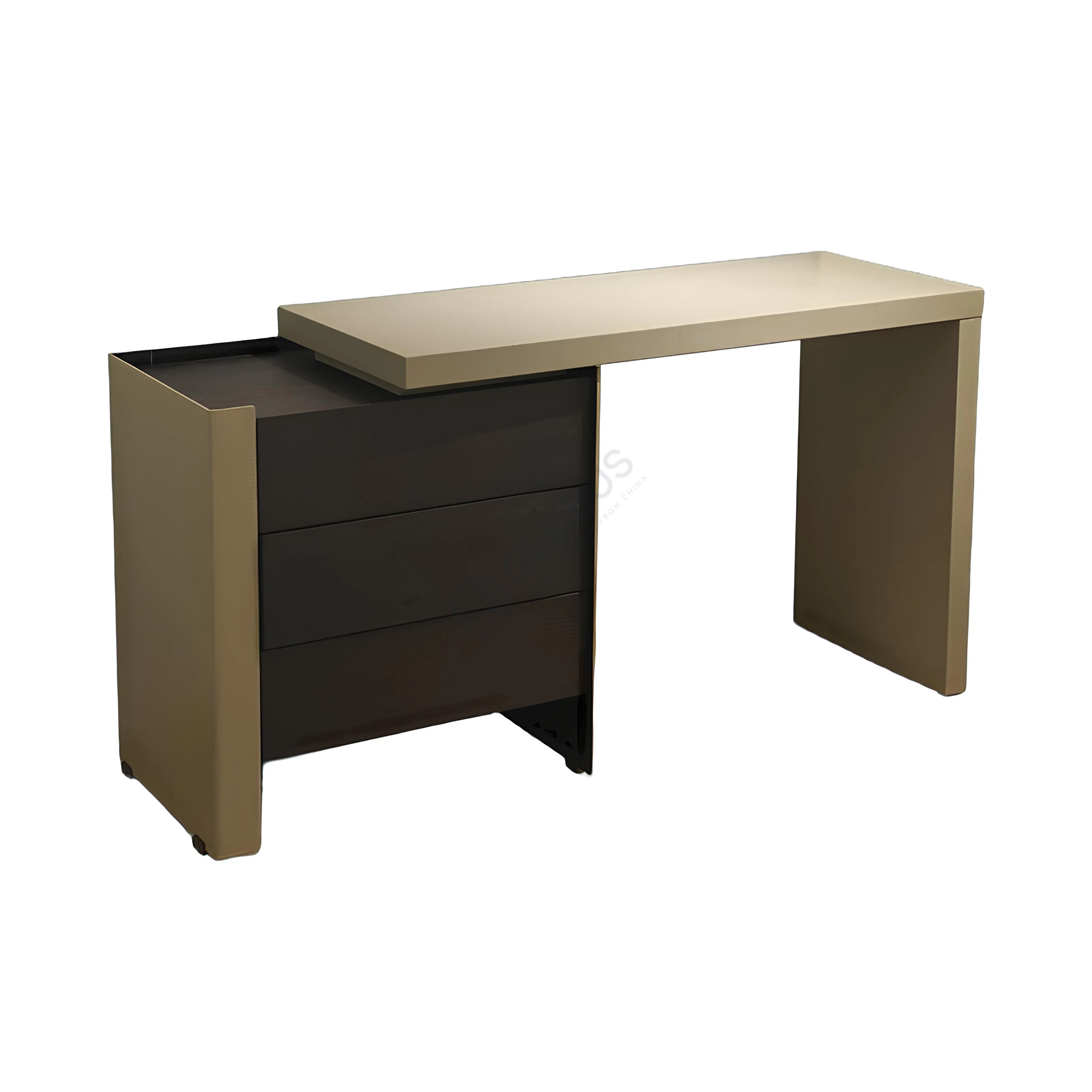 Crafted with care, the sideboard utilizes natural veneer for its primary surfaces, showcasing the authentic character of the wood grain. Beneath this elegant exterior, a sturdy plywood structure ensures durability. A refined accent detail on the side is finished in Eco Saddle Microfiber, introducing a unique tactile and visual dimension to the piece.