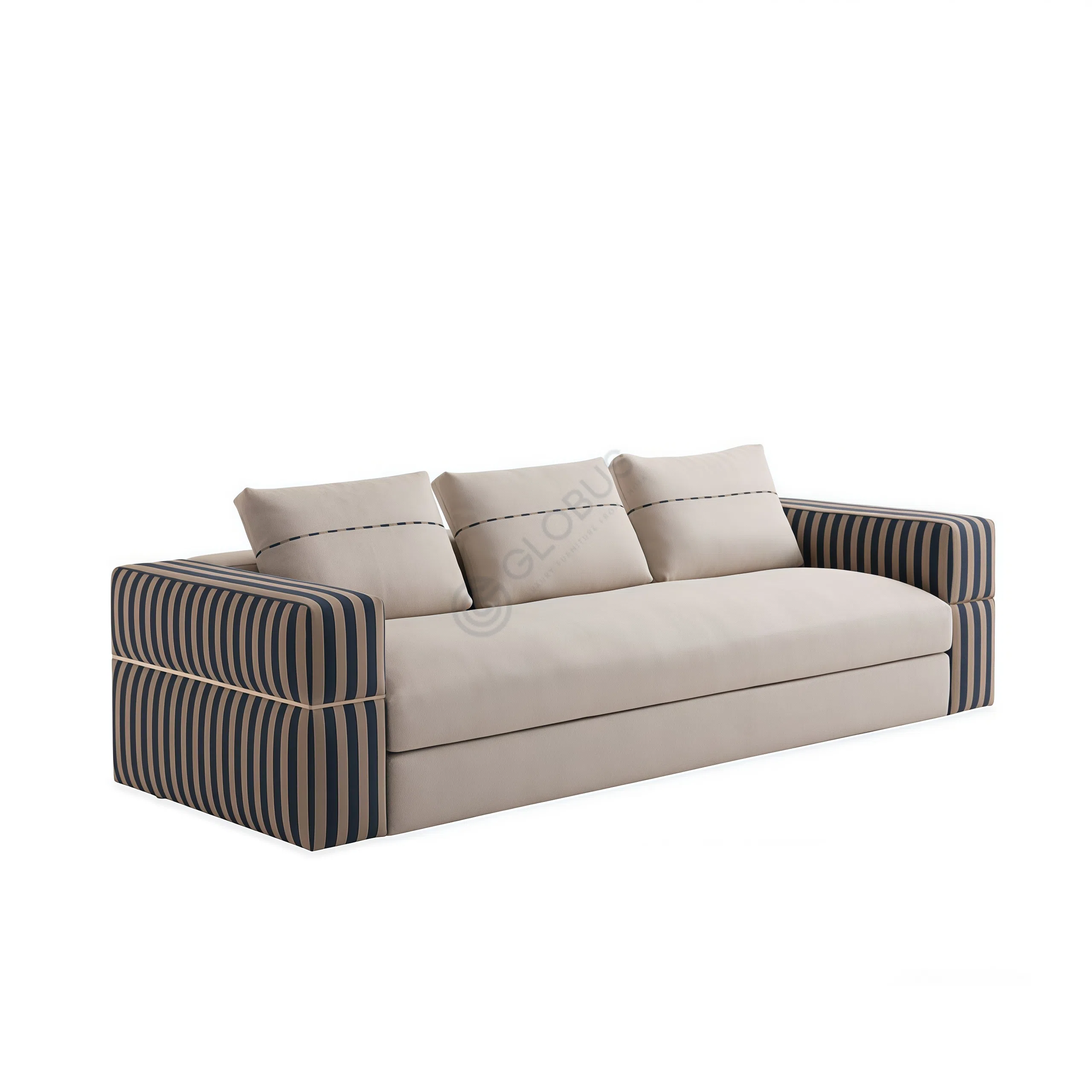 This bed features a distinctive headboard designed with plush, horizontal segments. Upholstered in contrasting textiles, the headboard presents a bold visual statement with its combination of soft neutral tones and a vibrant band of deep blue. This layered look provides both comfort and a strong design element.