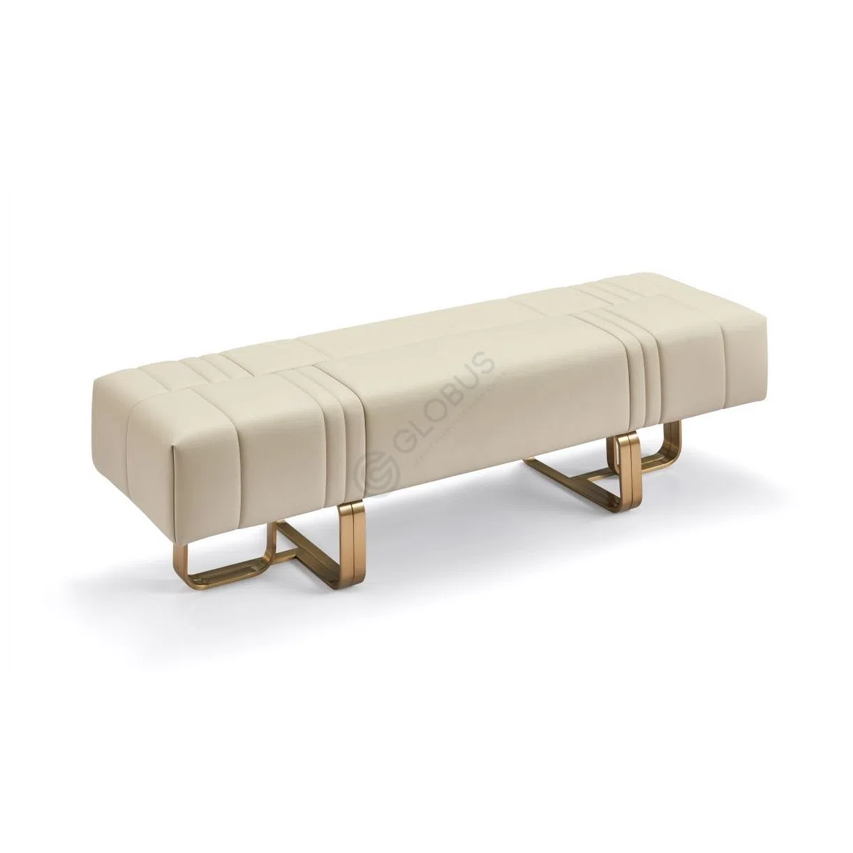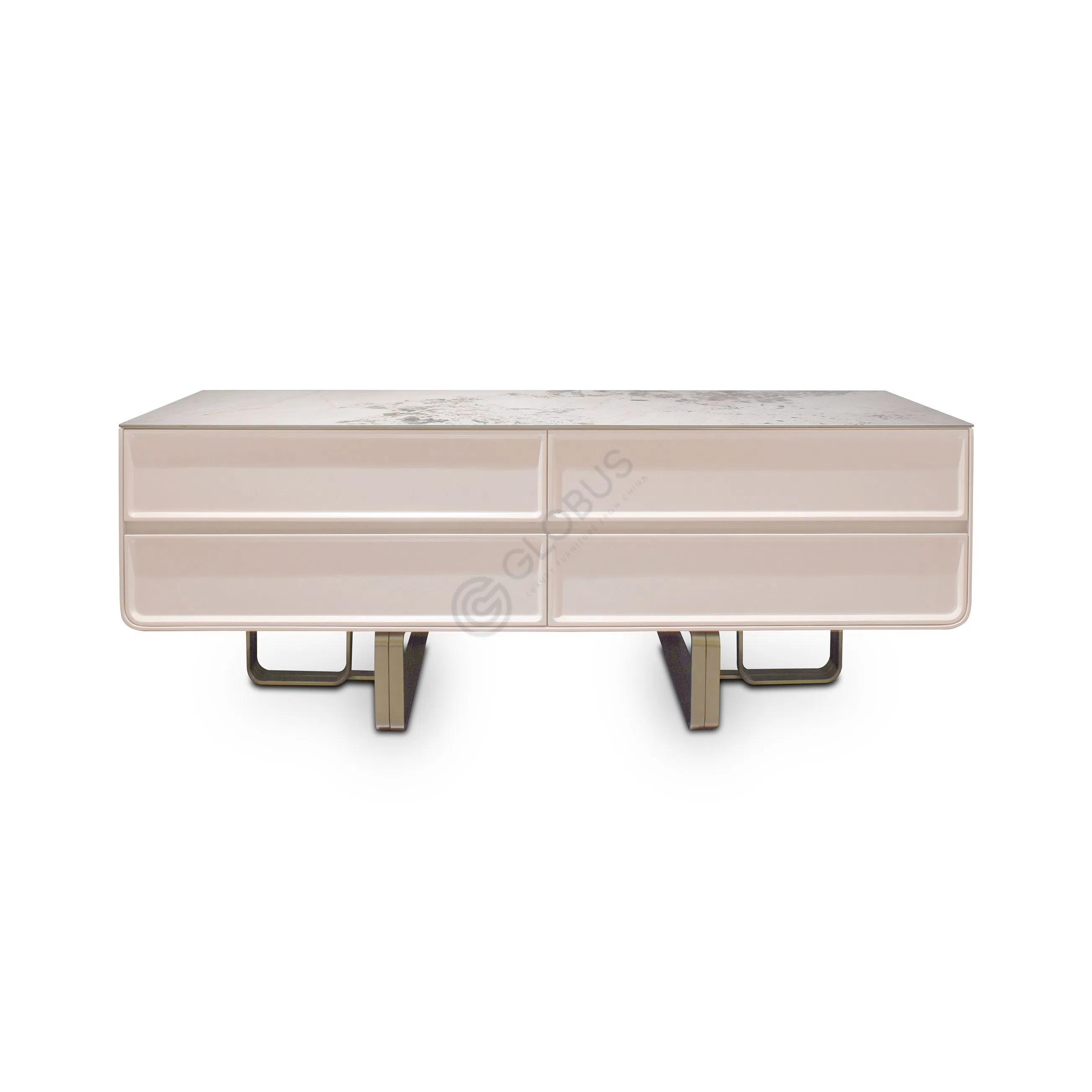 The body is upholstered in smooth microfiber leather, giving it a soft, tactile appeal while remaining easy to maintain. A natural stone top in soft beige hues sits elegantly above, providing a durable surface with gentle veining for added visual interest.
