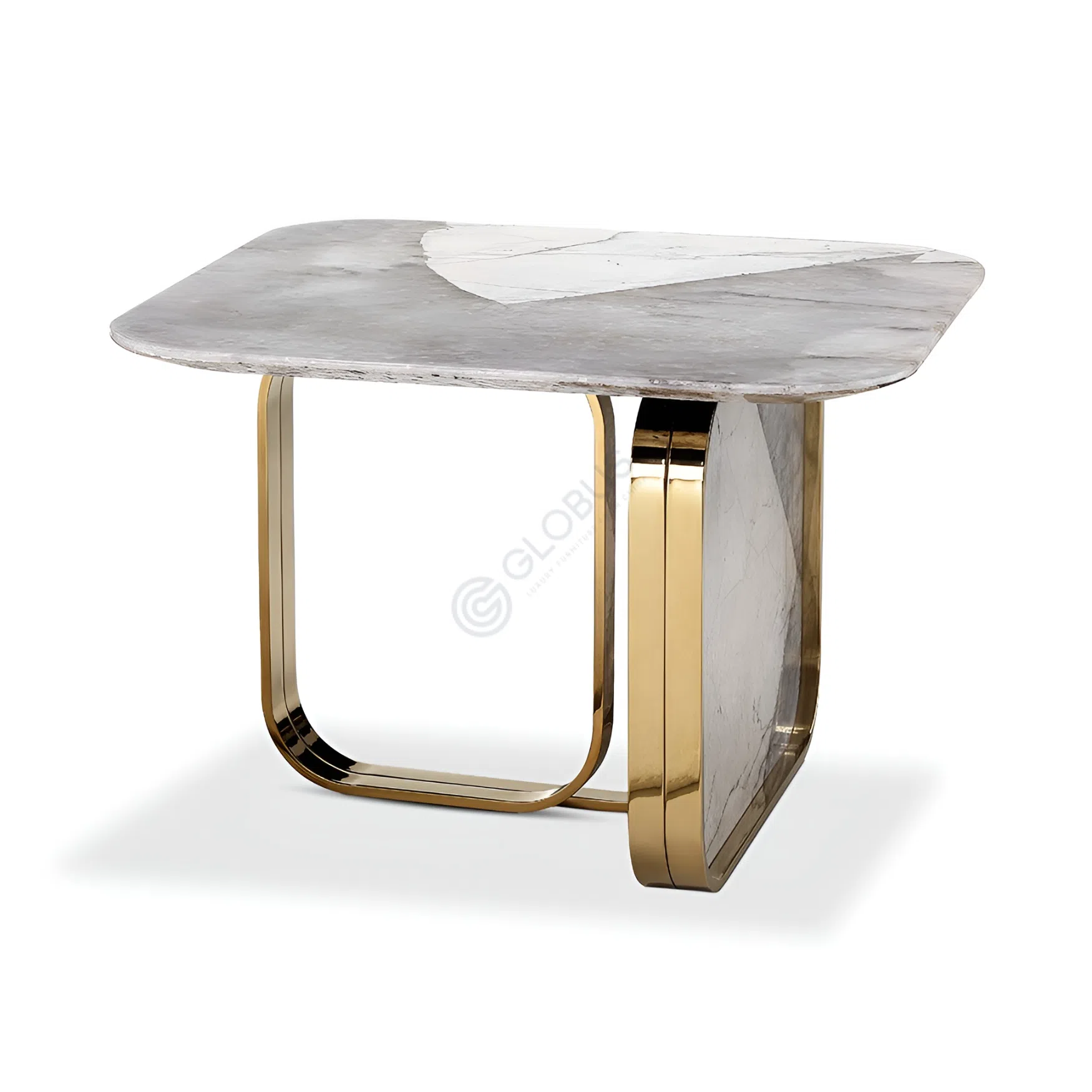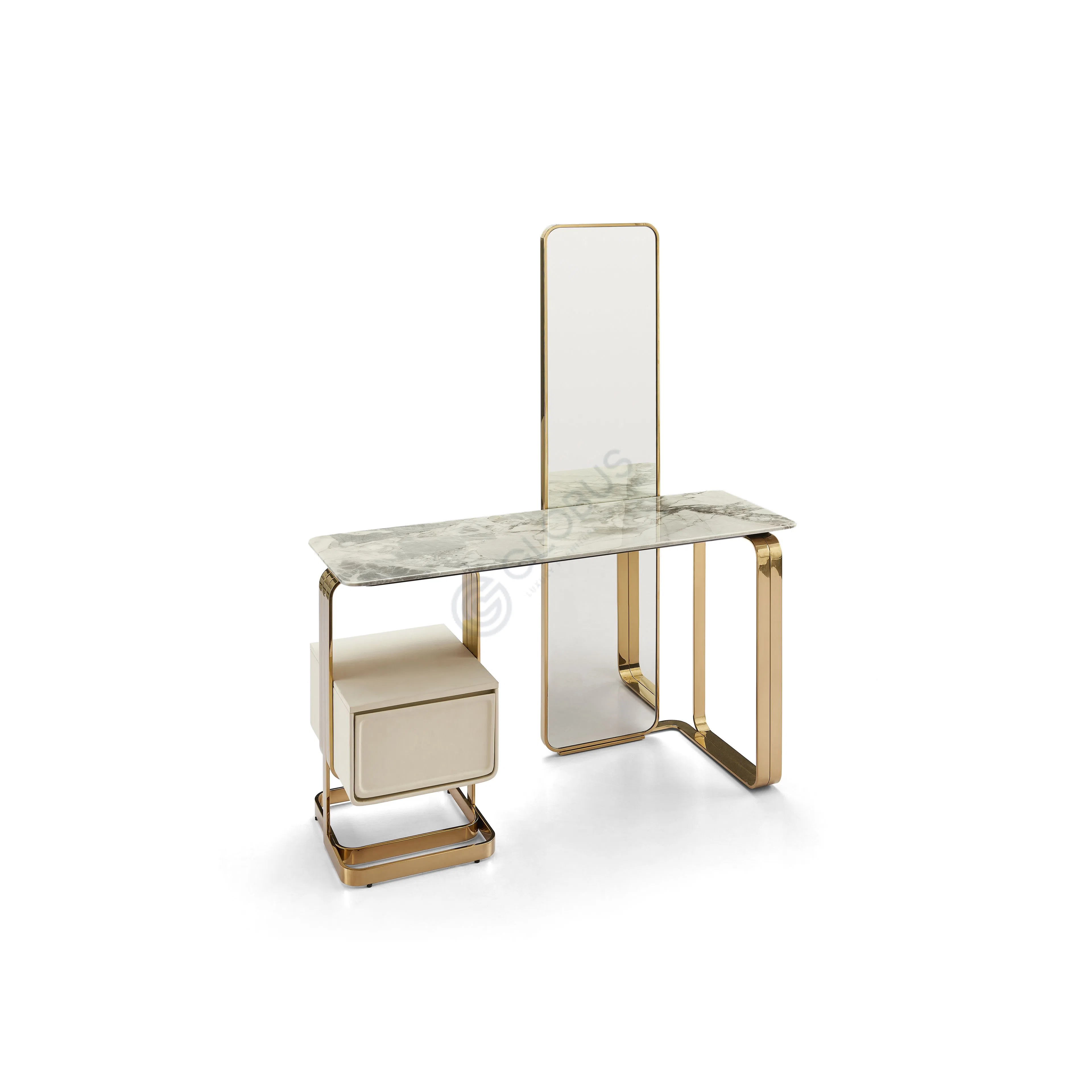 This modern bedside table blends clean lines with a balanced mix of refined materials, making it a sophisticated choice for any bedroom. The structure features a unique base in brushed stainless steel with a soft gold finish, offering a subtle contrast and stable support.