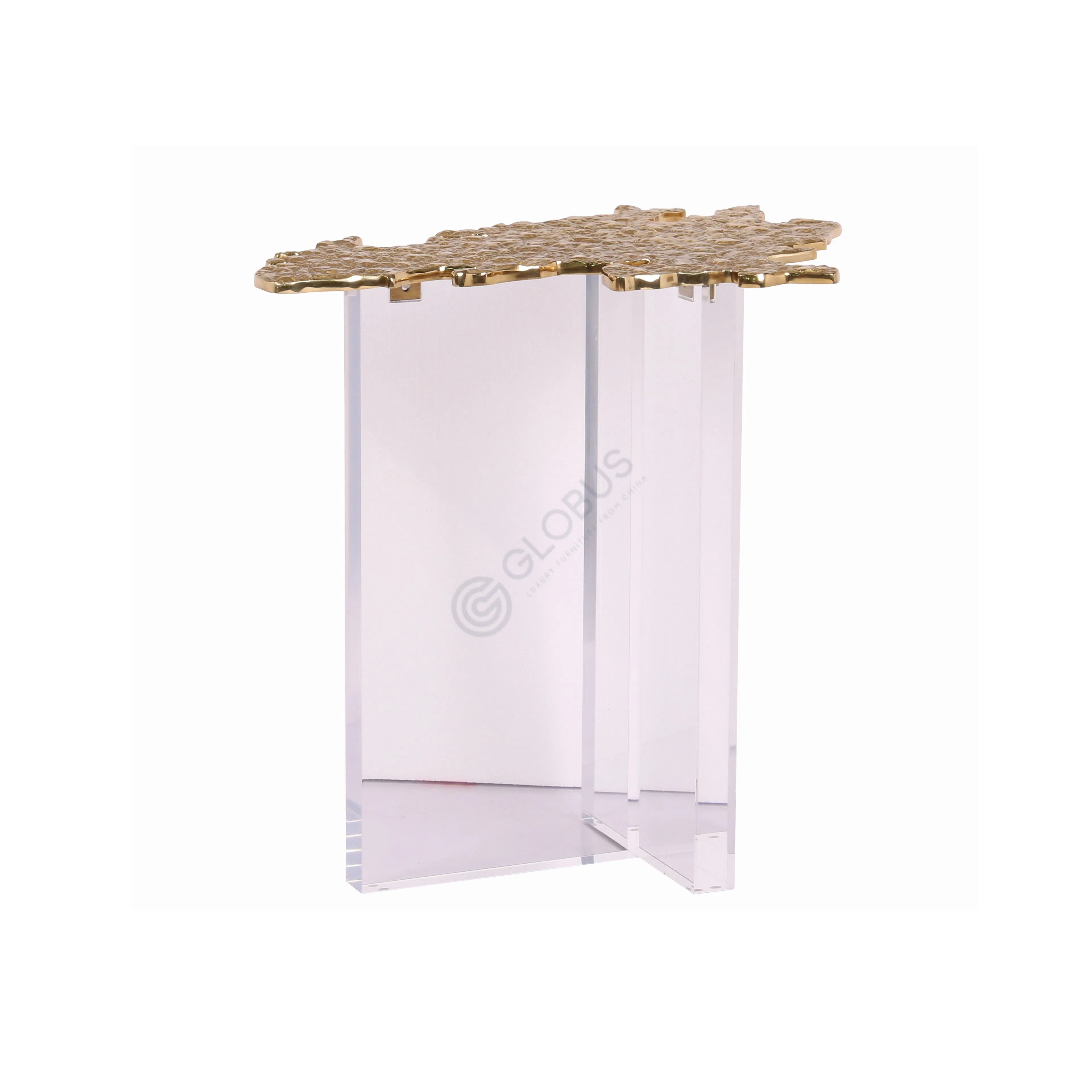 A sculptural coffee table combines a textured copper top with a clear acrylic base. The metal surface features subtle relief patterns that catch and reflect light, while the transparent support creates a sense of weightless elegance.