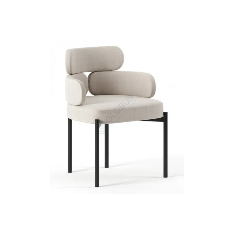 The chair presents a clean profile defined by cylindrical cushions and slender legs. A gently curved backrest and tapered arm supports flow into a softly rounded seat, all resting on a minimalist frame. The interplay of geometric forms and open space gives it a contemporary character that complements modern dining rooms and kitchens.