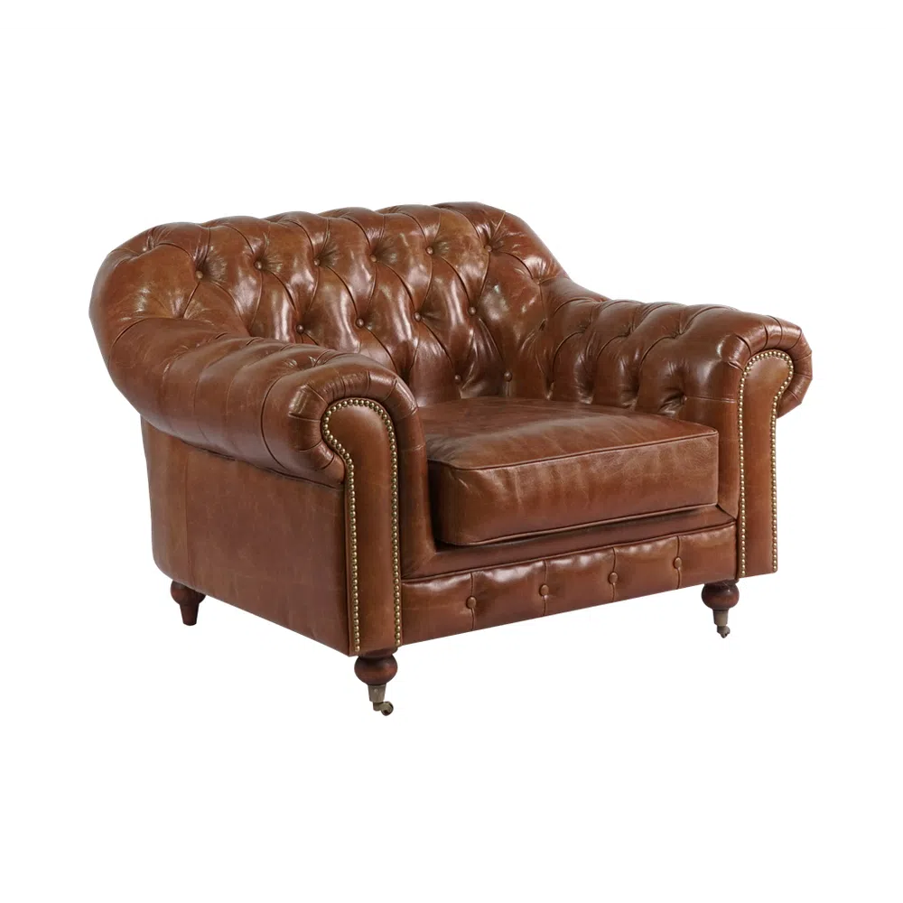 Upholstered in rich, full-grain leather, this sofa brings a warm and inviting presence to any living room. The surface is smooth to the touch, offering a natural patina that develops beautifully over time. Deep button tufting along the backrest and armrests enhances its American classic silhouette, while the subtle sheen of the leather complements a variety of interior palettes.