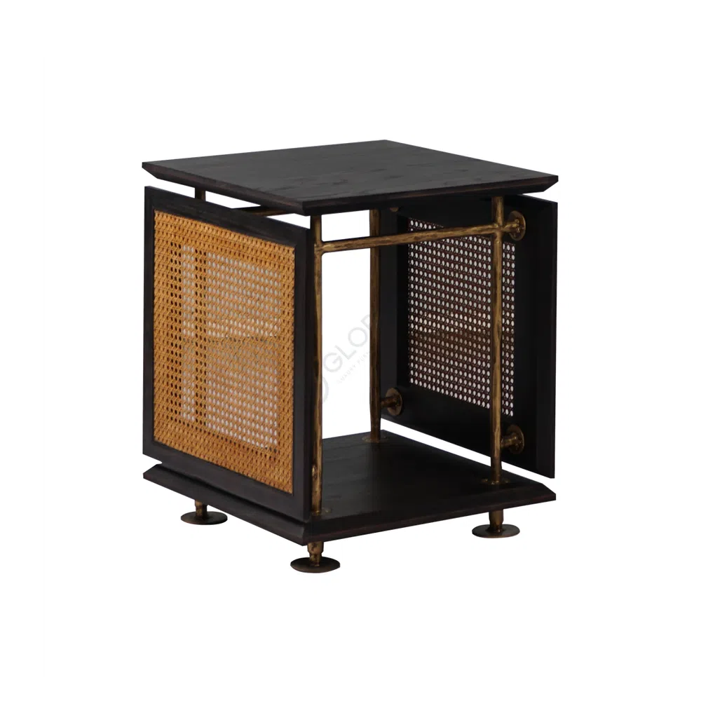 Distinctive side panels, crafted from natural rattan cane, introduce an organic texture and a subtle, open weave pattern. These elements, appearing to pivot gently, offer a dynamic visual interest and a captivating contrast against the dark wood. The piece is further elevated by its robust iron framework, which showcases a rich, antique brass finish, providing both structural integrity and a striking metallic accent.
