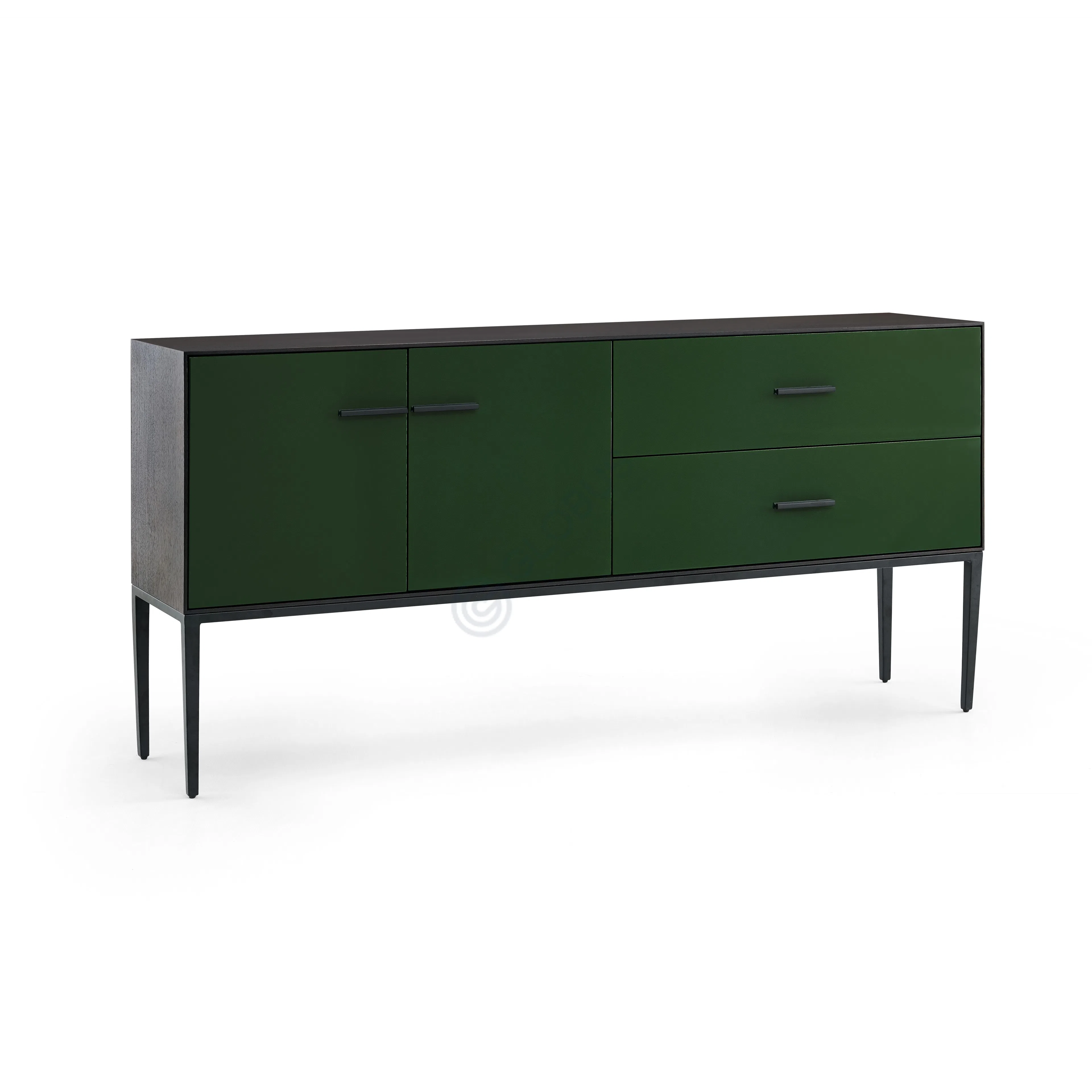 The cabinet's deep green finish blends effortlessly into contemporary interiors, creating a bold yet balanced aesthetic. Its slim handles and tapered legs provide subtle details that emphasize a modern touch. Thoughtfully designed, it features a combination of drawers and doors, offering ample storage space for organizing essentials while maintaining a tidy and stylish environment.