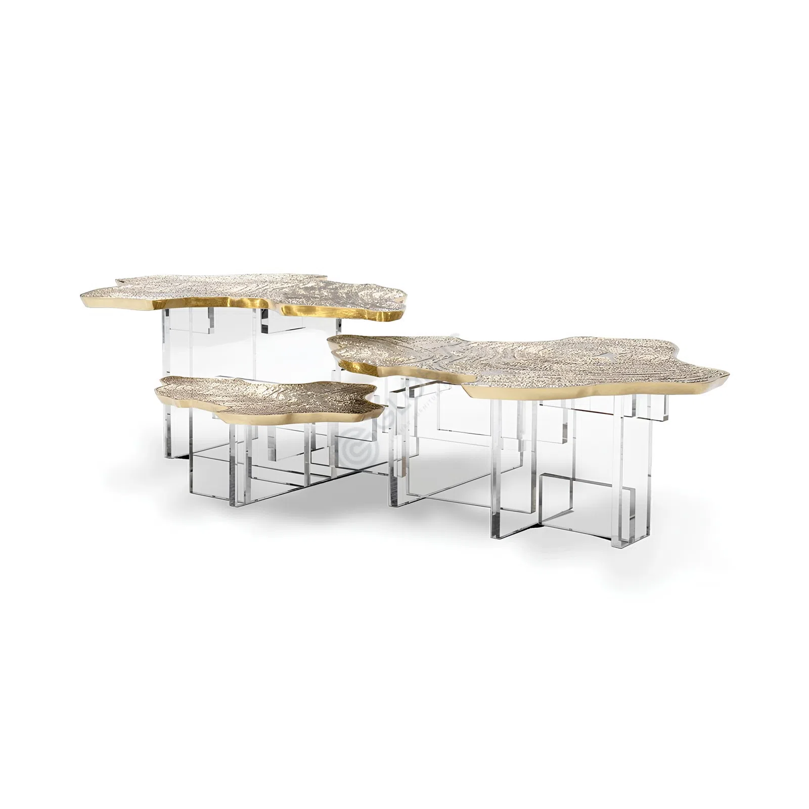 The base is crafted from thick, transparent acrylic, forming a clean, geometric structure that allows light to pass through, adding a sense of spaciousness. This clarity provides a beautiful contrast to the solid brass top.
