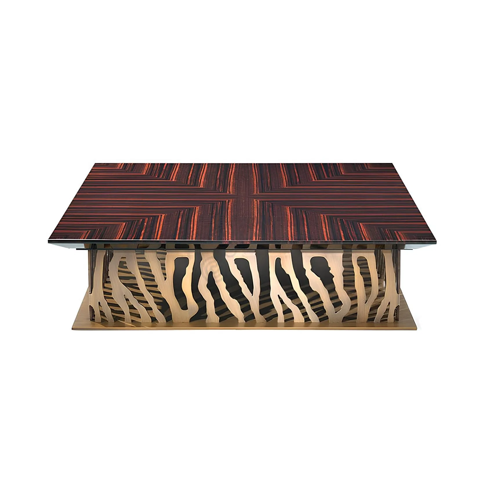 This dining table features a truly distinctive and artistic base crafted from polished stainless steel with a radiant finish. The base is composed of multiple sculpted elements that interlock and flow, creating a dynamic, sculptural form that instantly becomes the focal point of any room. It rests on a solid, rectangular platform providing stability and completing the sophisticated structure.
