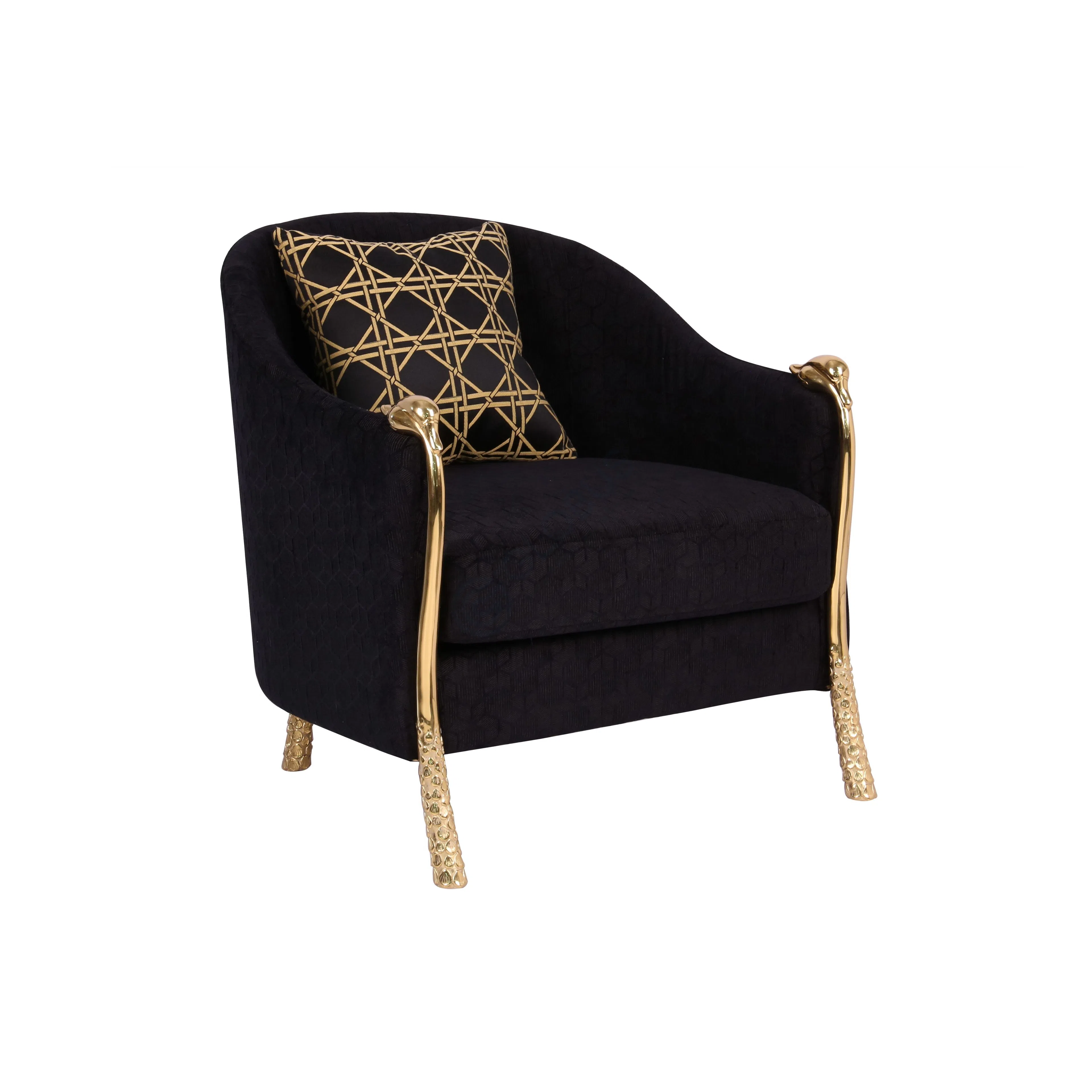 Craftsmanship is evident in the blend of fine materials. A robust solid wood frame provides a foundation of lasting quality, while the luxurious textile invites comfort. Distinctive brass elements adorn the arms and legs, featuring sculpted details that catch the light.