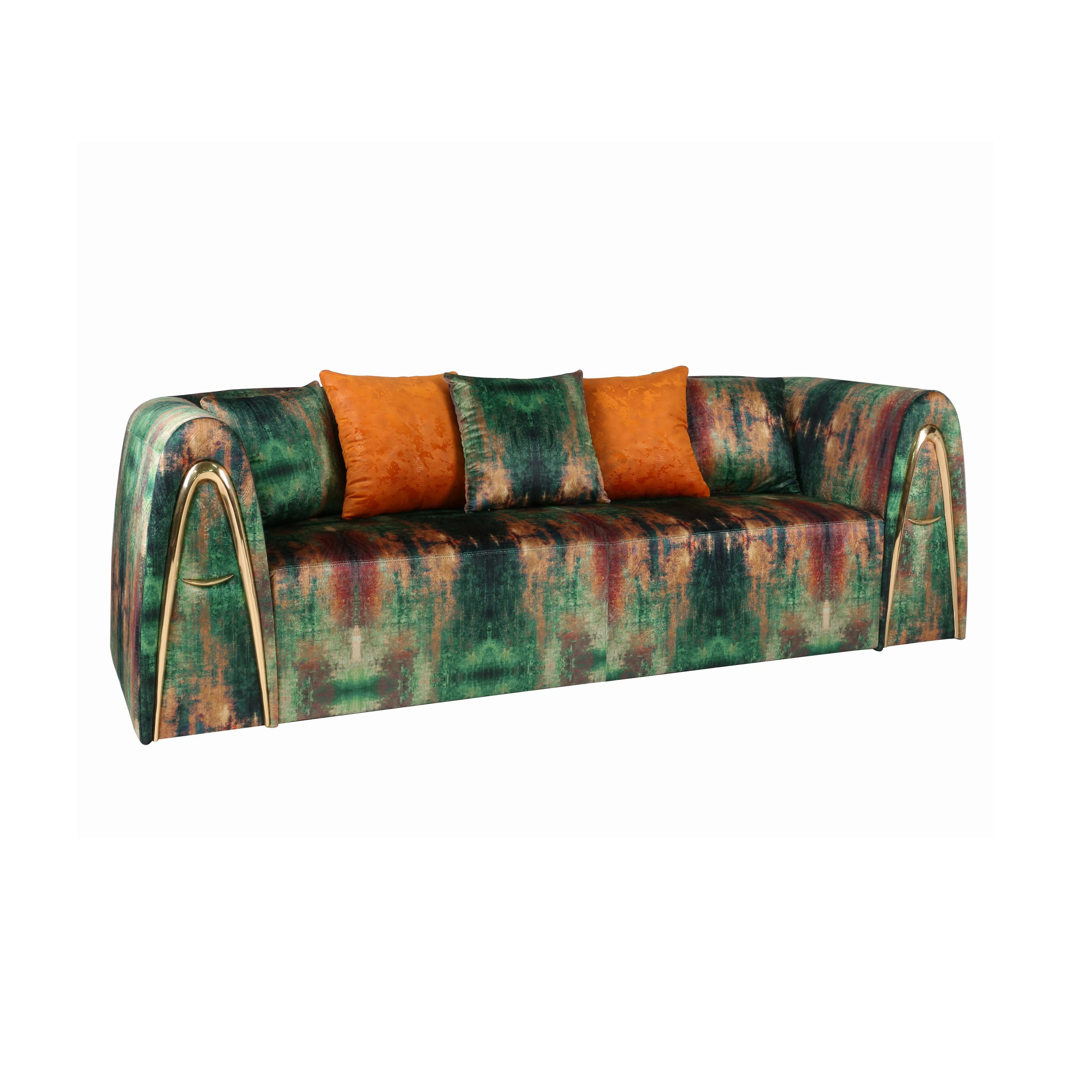 An armchair presenting a rich tapestry of colour, this piece immediately sets a sophisticated tone. The upholstery features an abstract, layered pattern in deep greens, warm browns, and hints of plum, creating a visually dynamic surface.