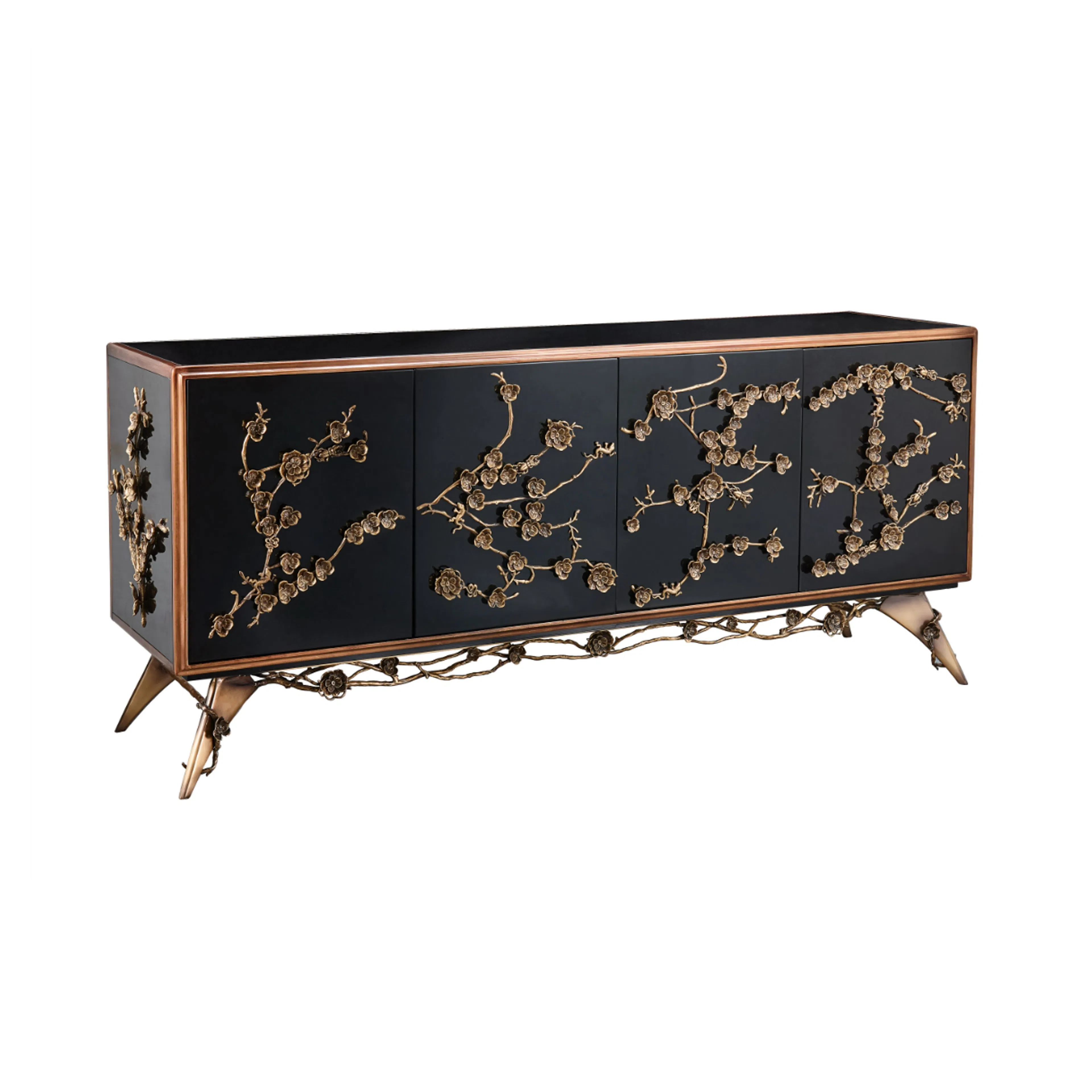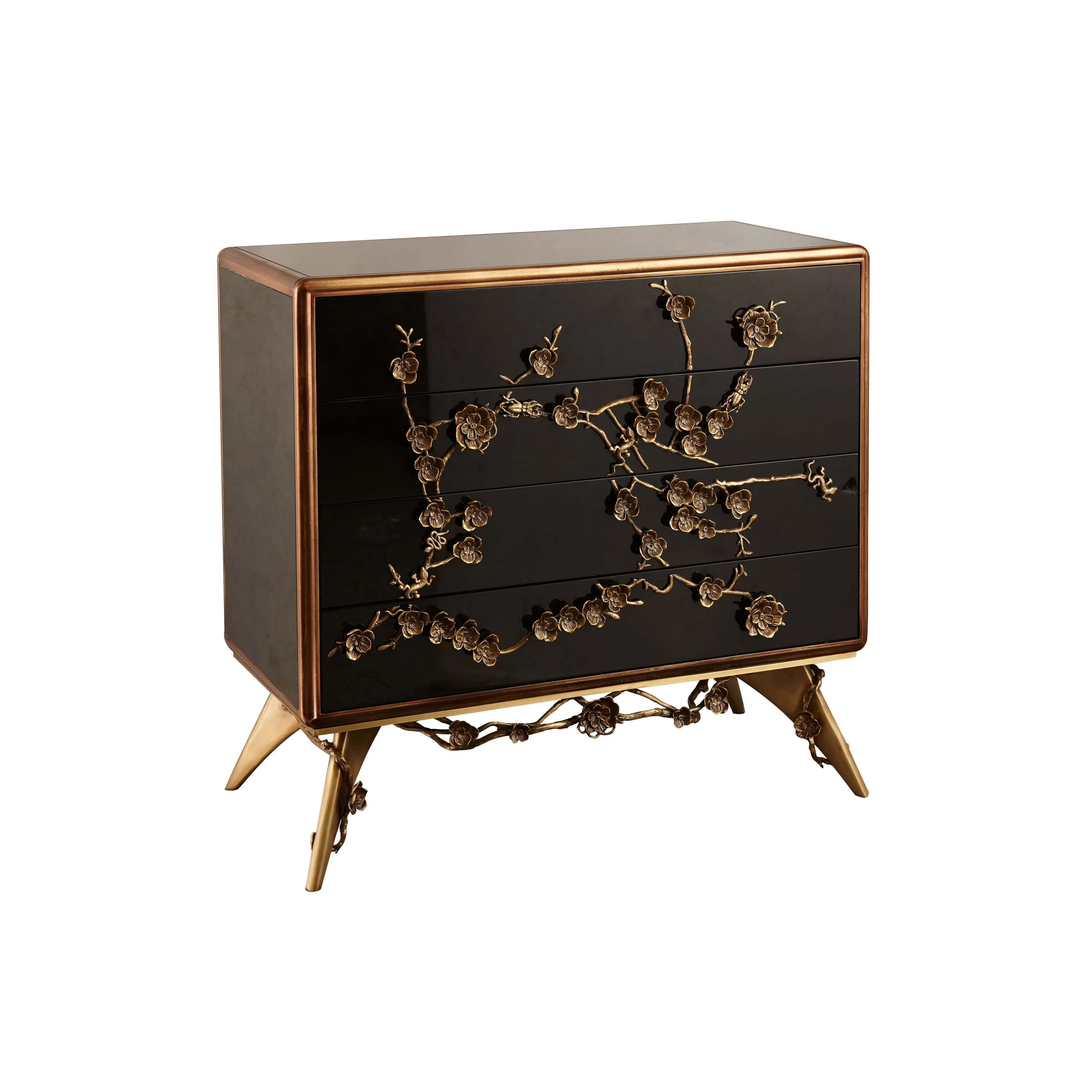 Crafted with precision, the structure is made from durable MDF, providing a smooth surface for the rich black lacquer. Complementing this is the intricate brass detailing, beautifully shaped into flowering branches that adorn the front of the two drawers and form the unique, sculptural base. This detailed metalwork adds a touch of artistry and visual interest.