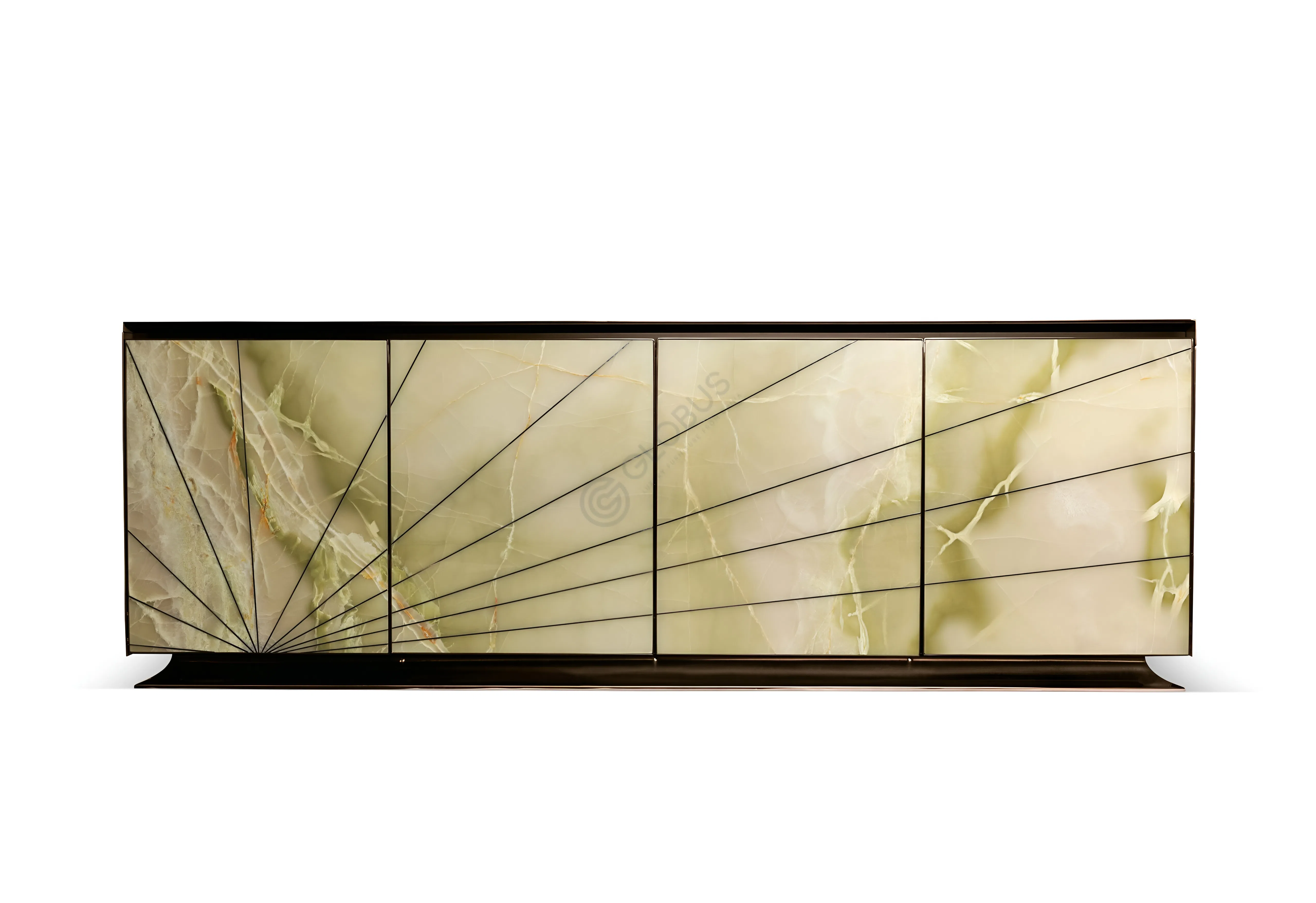 This central agate detail is enhanced by fine brass inlay, arranged in an elegant radial pattern. The table stands gracefully on sculpted legs made of polished brass, adding to its luxurious aesthetic. This piece is designed to bring a touch of refined glamour and functional elegance to the bedroom environment.