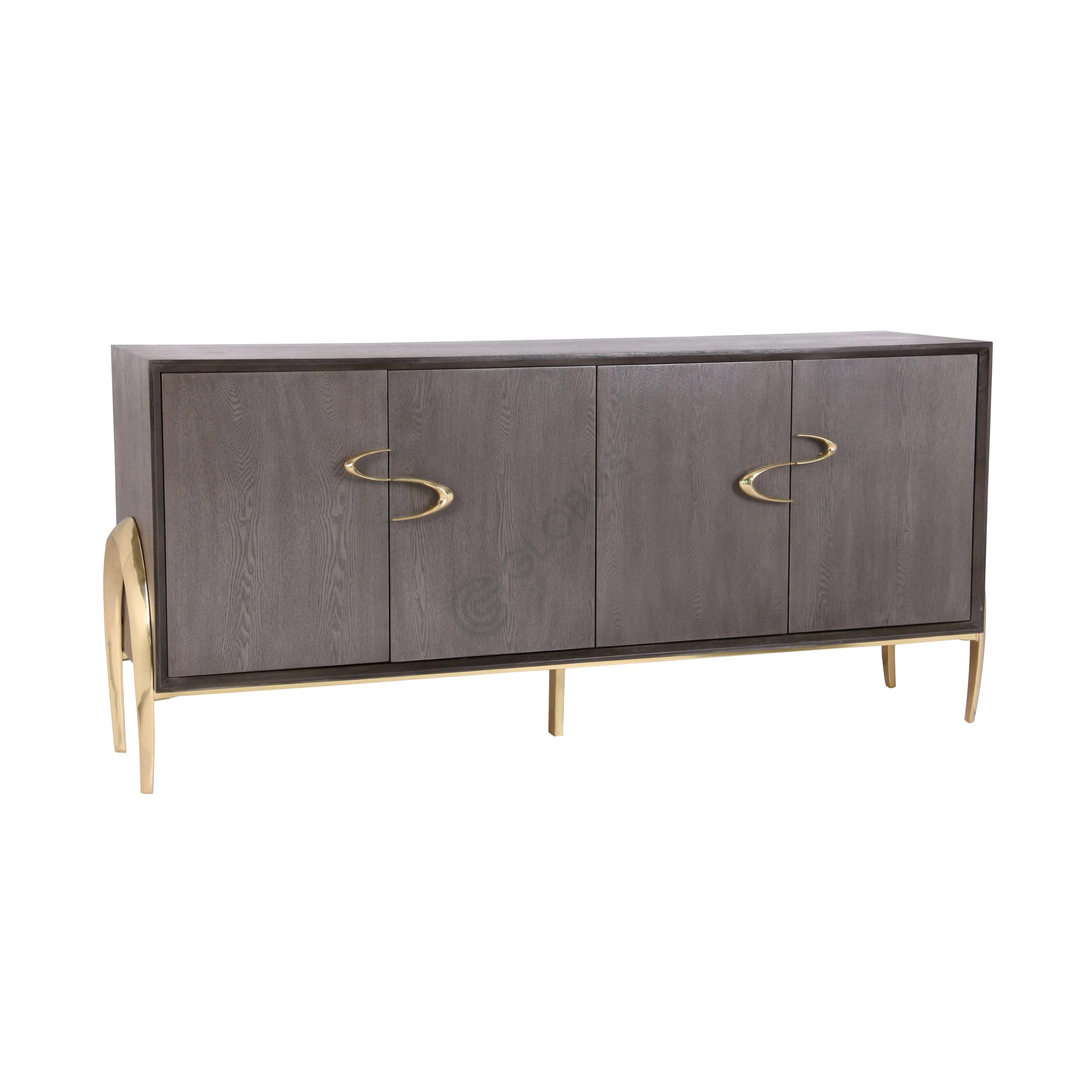 Constructed using a combination of natural veneer, robust MDF, and reliable plywood, this cabinet is designed for durability and lasting appeal. The striking brass details, from the uniquely shaped handles to the sculptural base, underscore the quality craftsmanship and attention to detail characteristic of premium furniture.