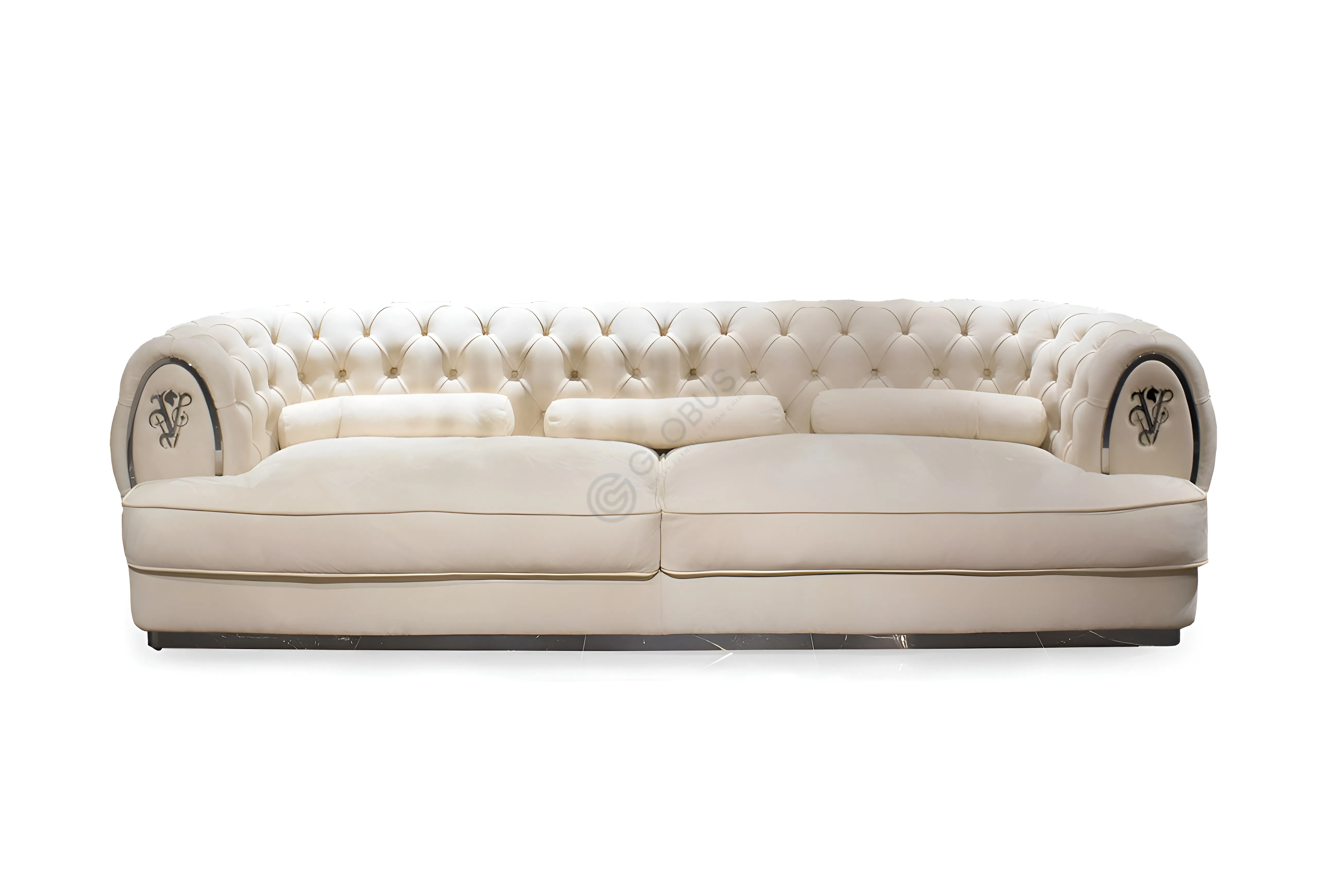 A graceful fusion of modern and neo-classic influences is evident in its form. The gently curved armrests are highlighted by sleek metallic trim, accentuating the design. Each armrest is adorned with a sophisticated metallic emblem, adding a distinct, understated flourish.