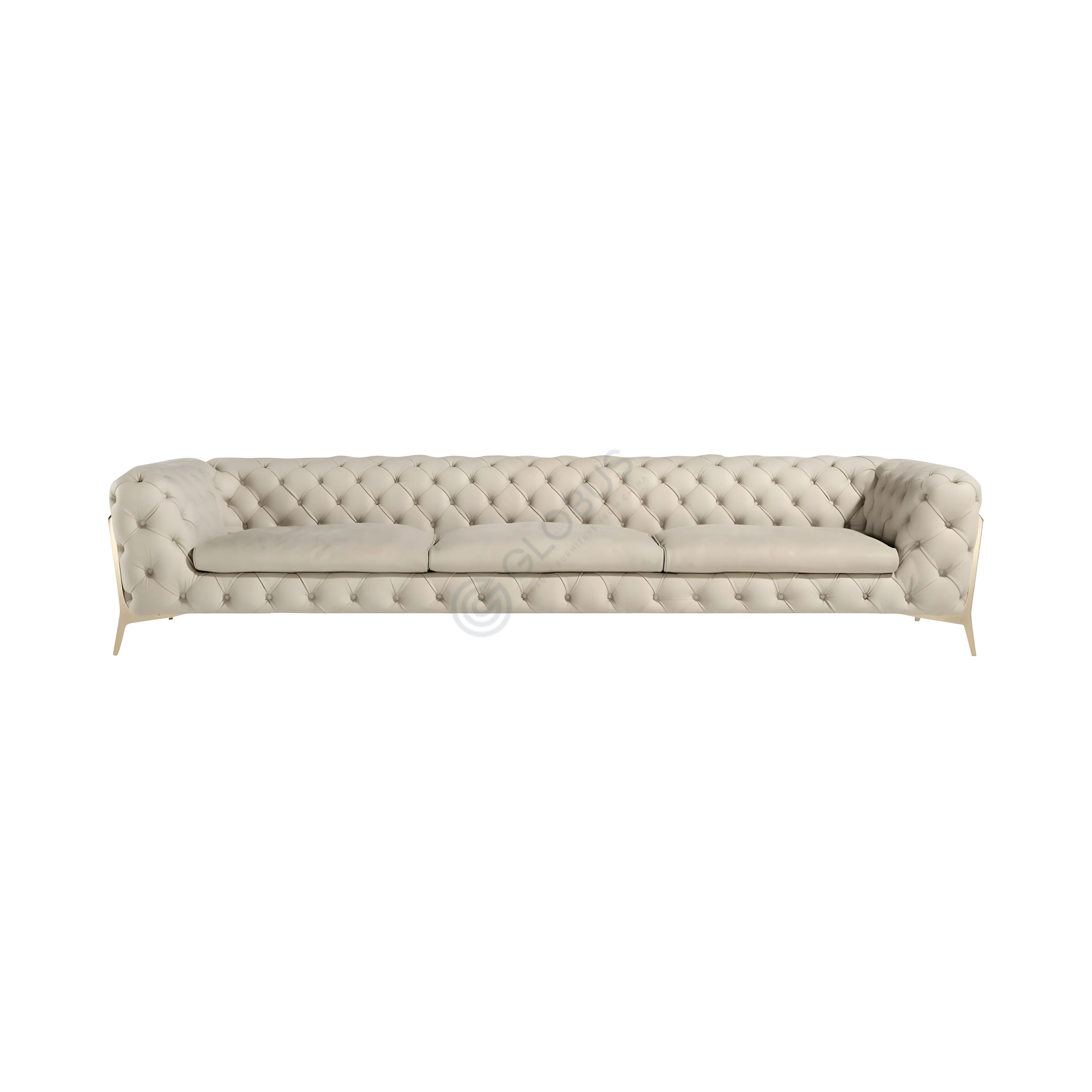 This armchair offers a sophisticated presence, blending classic tufted elegance with contemporary design. Its inviting form and refined details make it a distinctive piece for any living space. The design subtly references Art Deco glamour while maintaining a sleek, modern appeal.