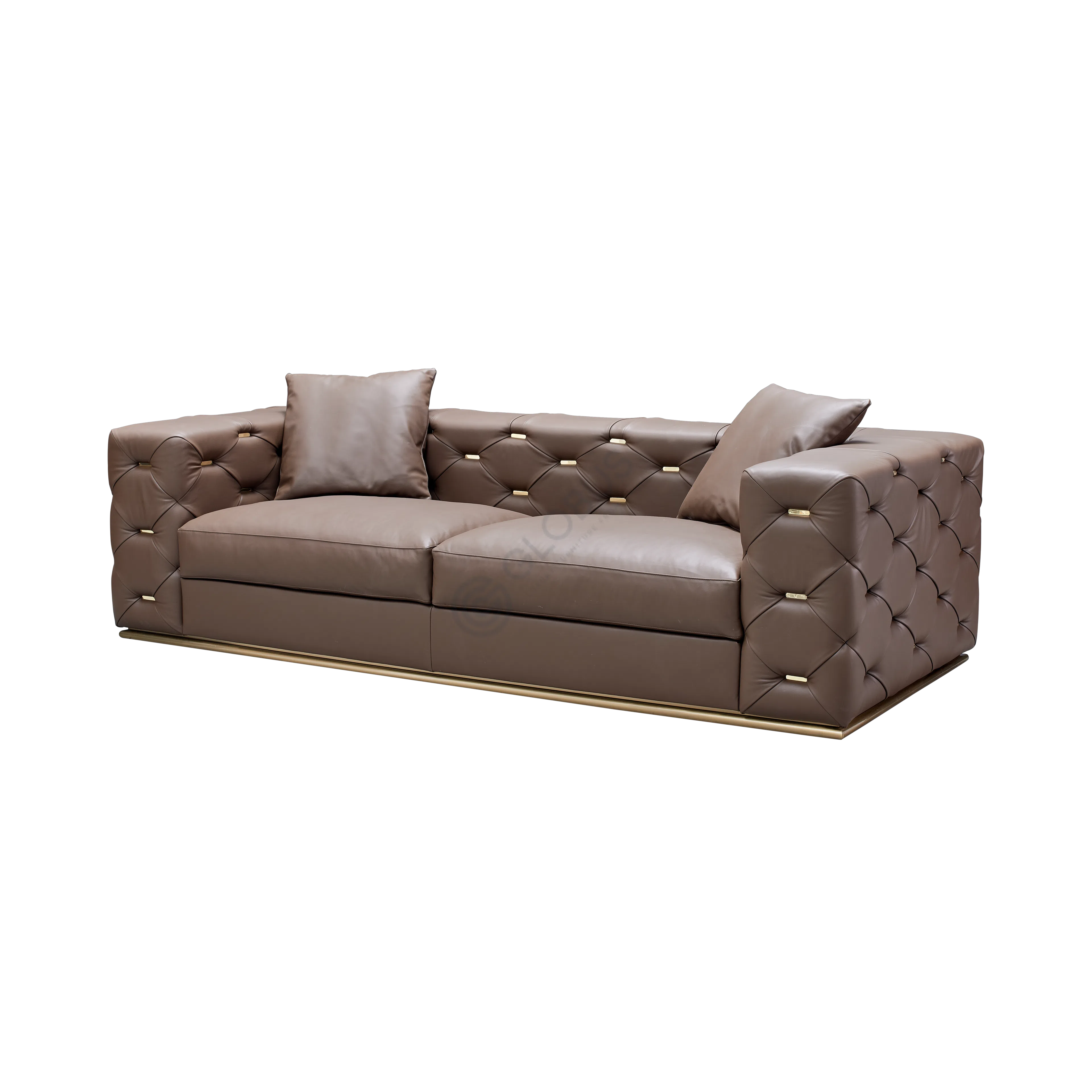 This armchair presents a sophisticated form, upholstered in a quality textile with deep diamond tufting on its sides and back, contrasting with the smooth seat and cushion. Polished stainless steel accents are integrated within the tufting and form a slim base, adding a modern gleam to its structured silhouette. The warm, inviting colour enhances its luxurious appearance.