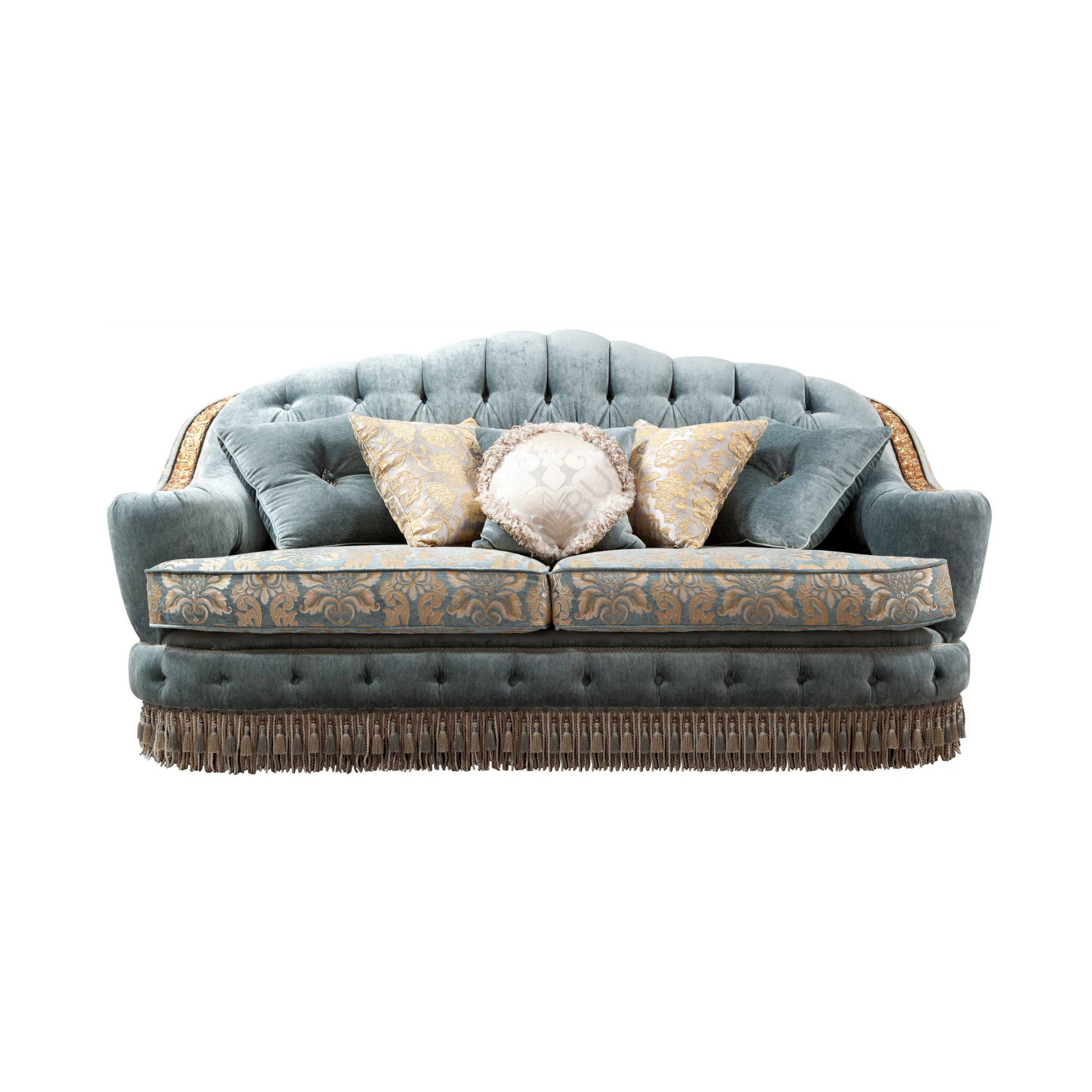 A high, tufted back and gracefully scrolled arms, accented with ornate golden details, define its distinguished silhouette. A plush, button-tufted cushion in a contrasting velvet hue enhances both comfort and visual appeal. The base is finished with a decorative fringe, adding a final touch of classic elegance.