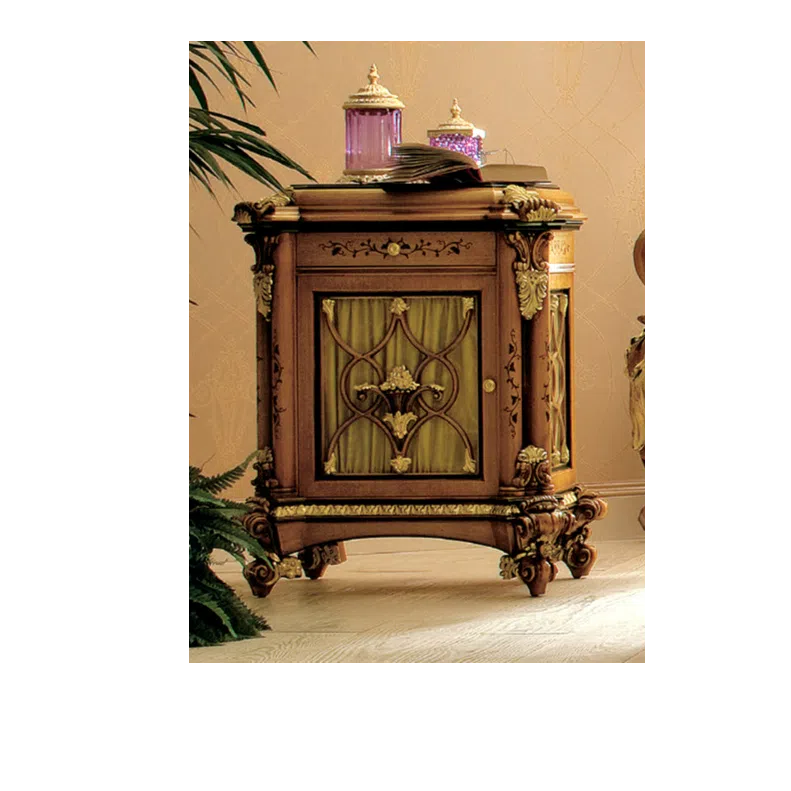 This elegant bedside table embodies the richness and ornate beauty of Baroque design. Its distinct shape and detailed craftsmanship make it a striking addition to a luxurious bedroom setting.