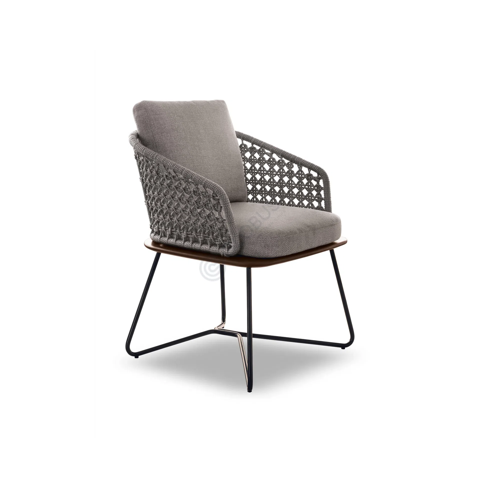 Crafted with attention to detail, the sofa features a sturdy aluminum frame providing essential support. Elegant woven rope forms the distinctive side panels, adding texture and visual interest. A solid wood element runs along the base, offering a warm, natural contrast to the sleek metal legs.