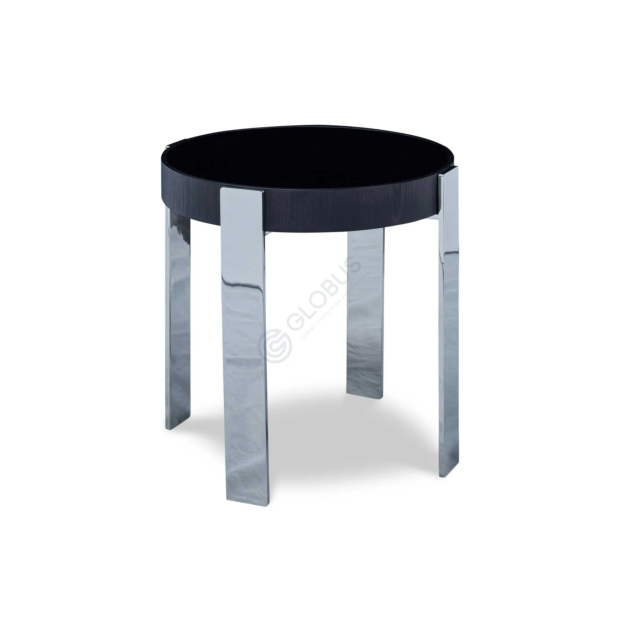 Supported by slender, dark stainless steel legs, the armchair possesses a clean, modern elegance. The combination of materials and shapes results in a piece that is both substantial and visually light. It serves as a refined addition to a living room, providing a statement of contemporary style and a comfortable place for relaxation.