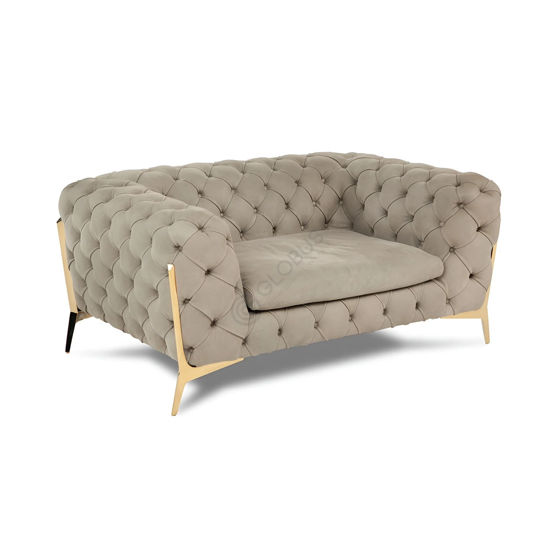 Crafted with meticulous attention to detail, this sofa features a sturdy internal frame constructed from solid wood and plywood, ensuring lasting durability. The exquisite textile upholstery is precisely button-tufted, highlighting the intricate craftsmanship involved. A sleek, polished stainless steel frame gracefully outlines the sofa's silhouette and forms its elegant legs, adding a distinctive modern touch and a subtle sheen.