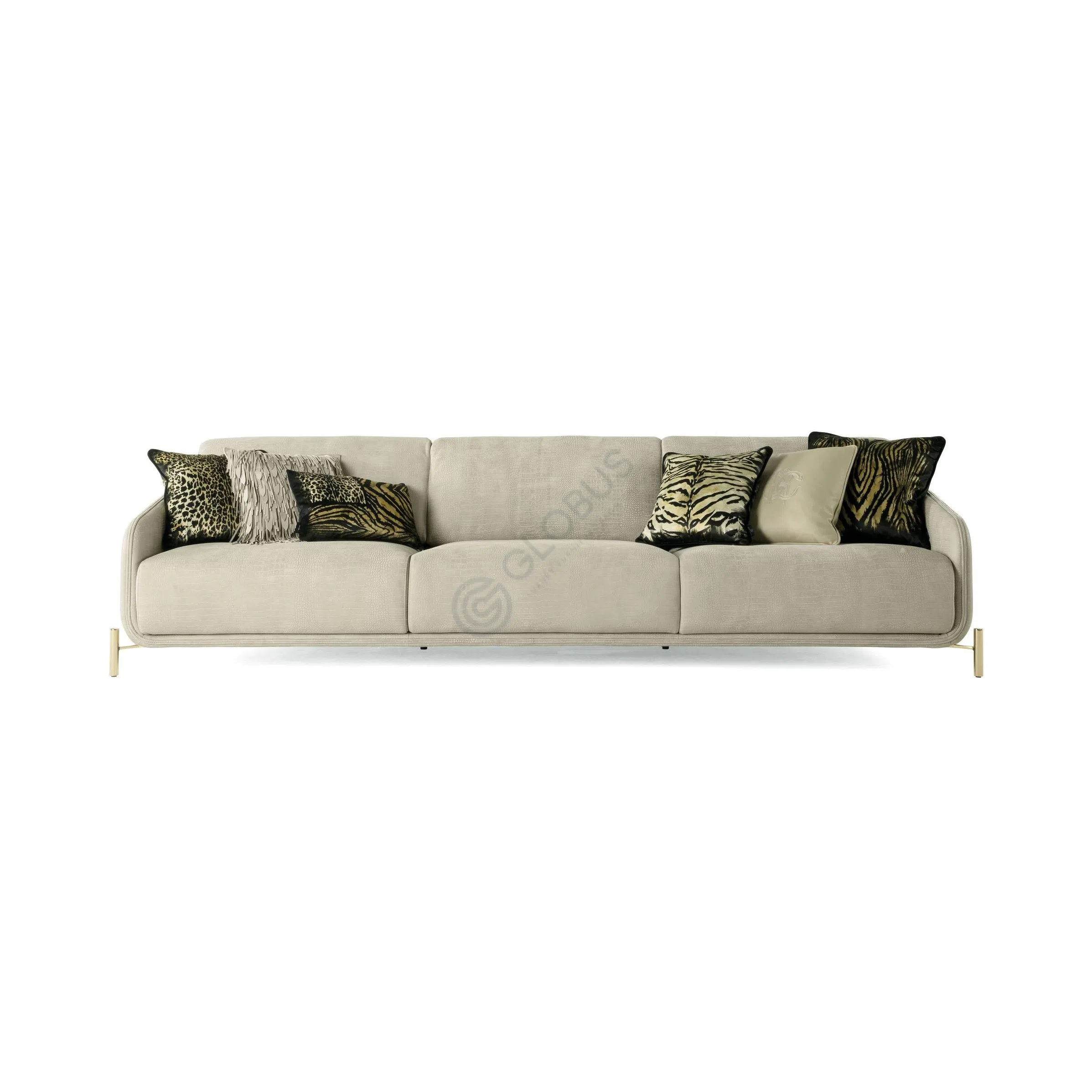 The armchair rests gracefully on slender, polished stainless steel legs, finished in a lustrous gold tone. These metallic accents provide a contemporary lift, enhancing the piece's luxurious appeal and completing its distinguished silhouette. It stands as an exquisite addition, ready to define a luxurious interior.