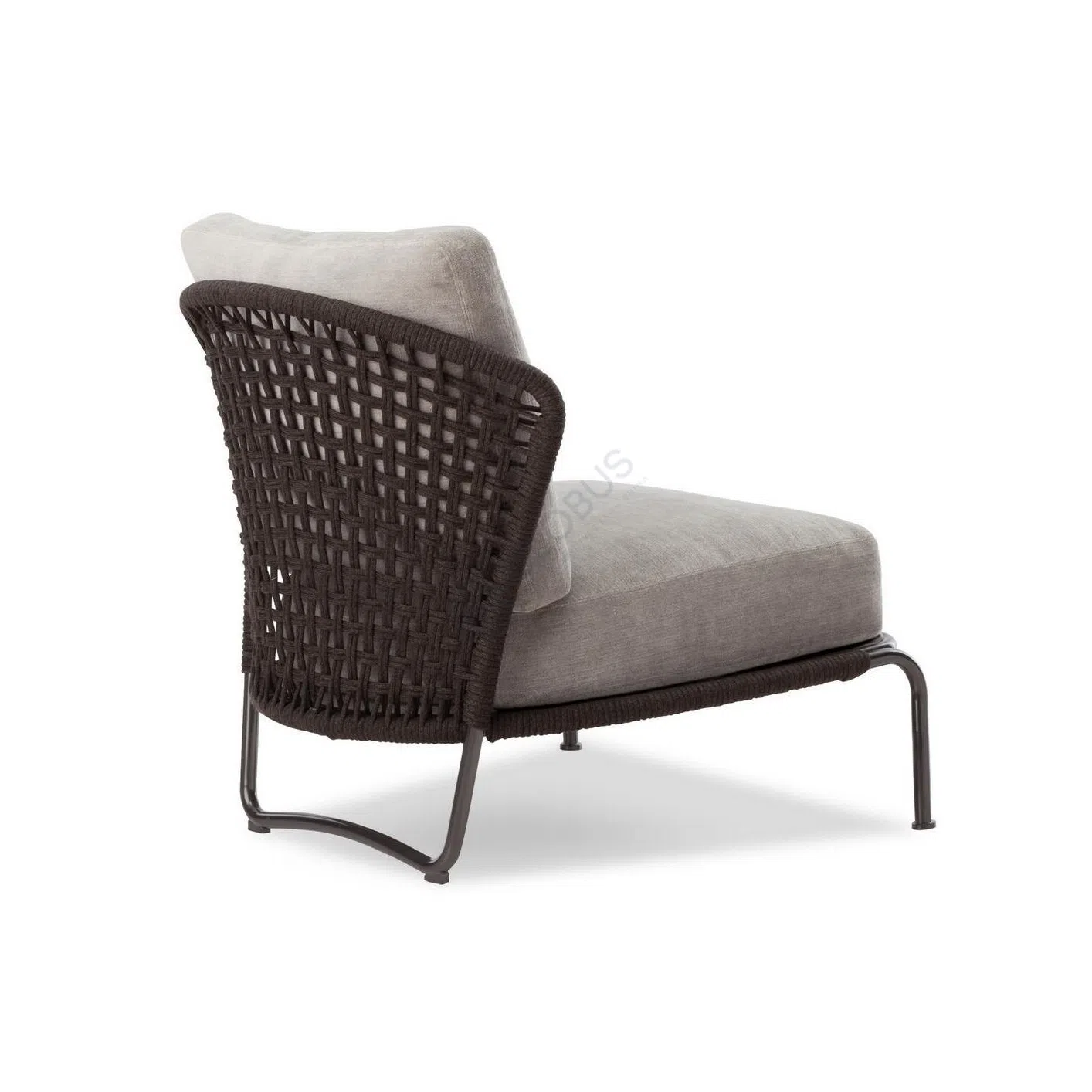The structure features a robust aluminum frame providing strong, stable support. The curved back and arms are intricately woven with high-quality rope, forming a visually light yet supportive shell that embraces the sitter.