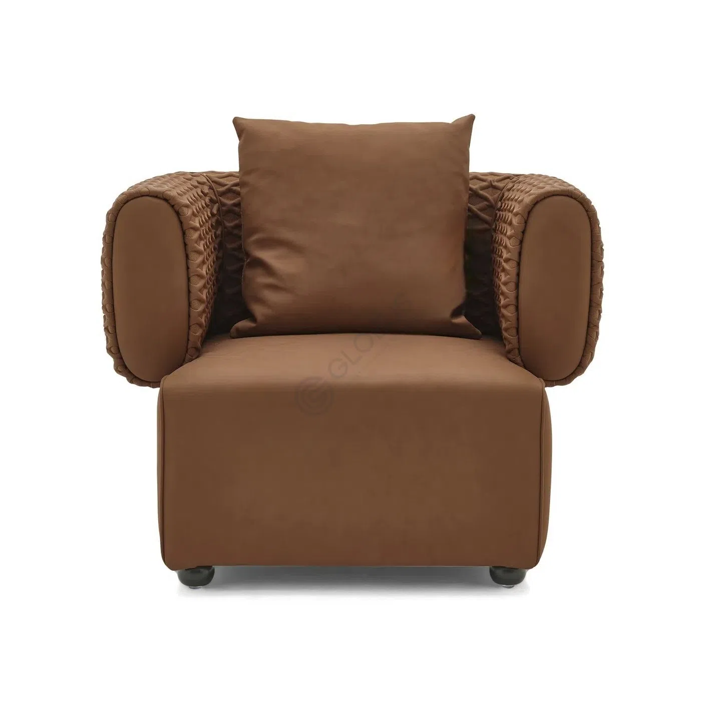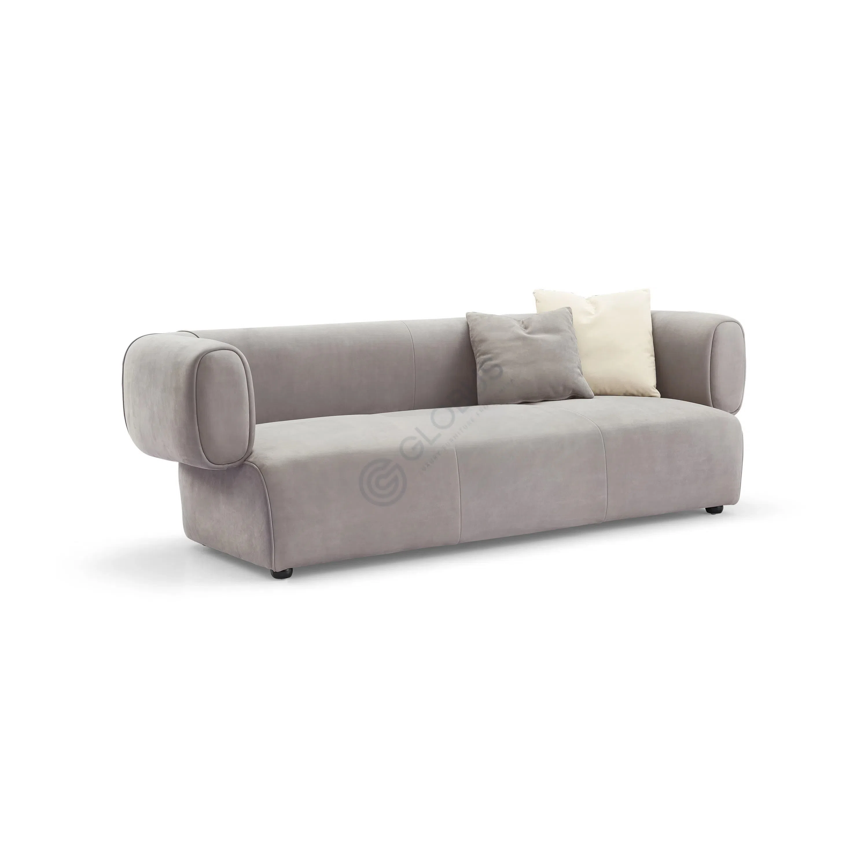 Constructed with a solid wood and plywood frame for durability, the piece incorporates premium textile upholstery and a robust stainless steel base. This combination of high-quality materials ensures both lasting structure and a luxurious feel, embodying a blend of modern aesthetics and expert craftsmanship.