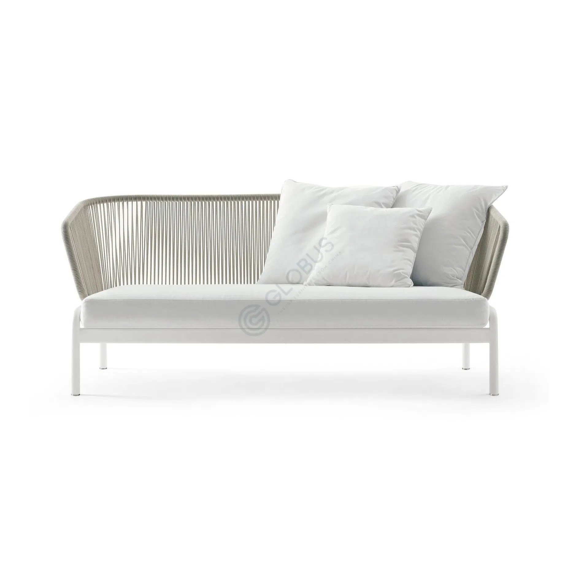 The structure features a durable aluminum frame, providing stability and resistance suitable for outdoor environments. A distinctive back and armrest detail is crafted from woven rope, adding texture and a touch of contemporary elegance. Plush textile cushions complete the design, offering a soft and inviting surface for lounging.