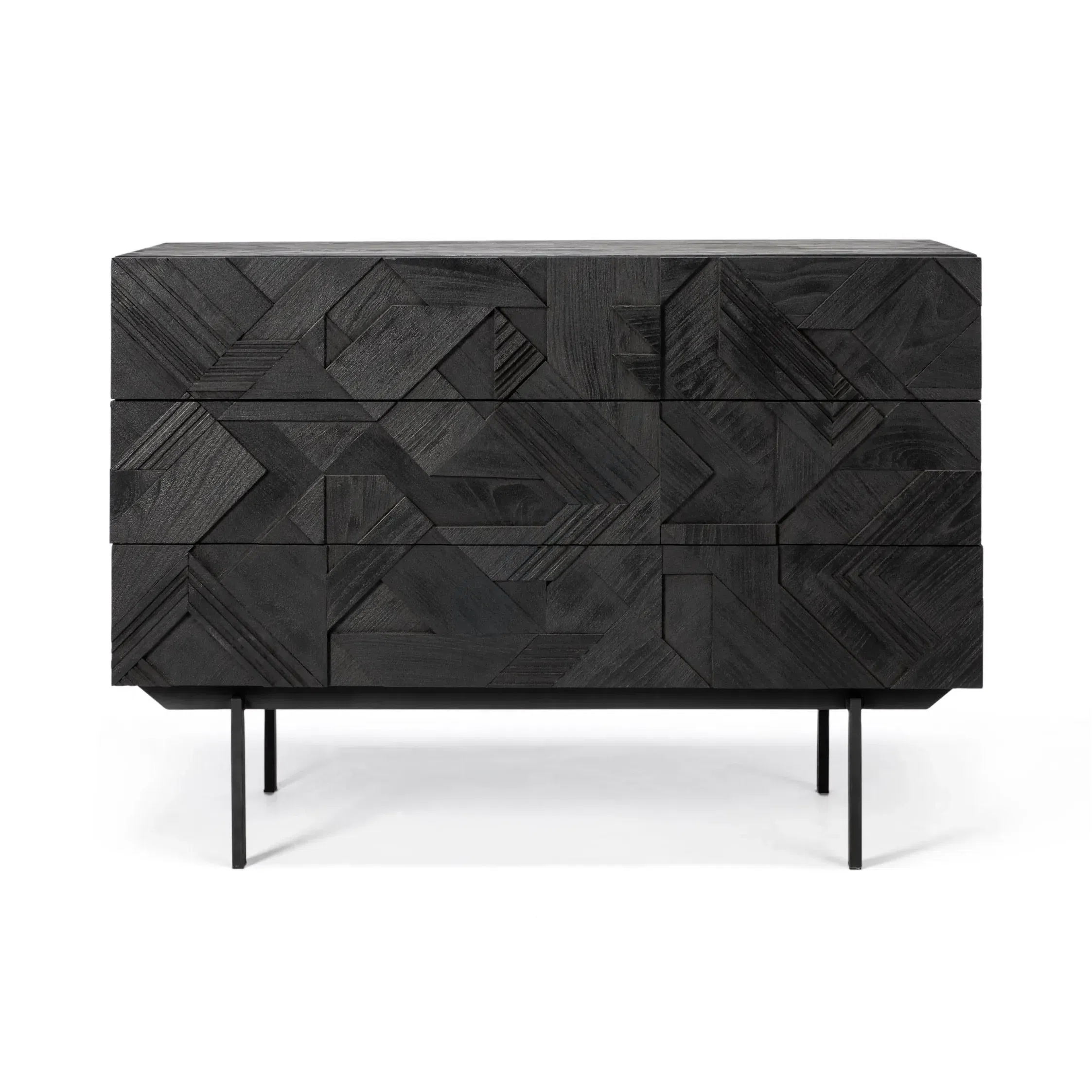 Introducing a stylish and functional TV stand designed to enhance your living space. Crafted from solid wood, natural veneer, and plywood, this piece showcases a sleek, modern aesthetic with a unique geometric pattern that adds character to any room. The sturdy metal legs provide stability while maintaining a lightweight appearance.