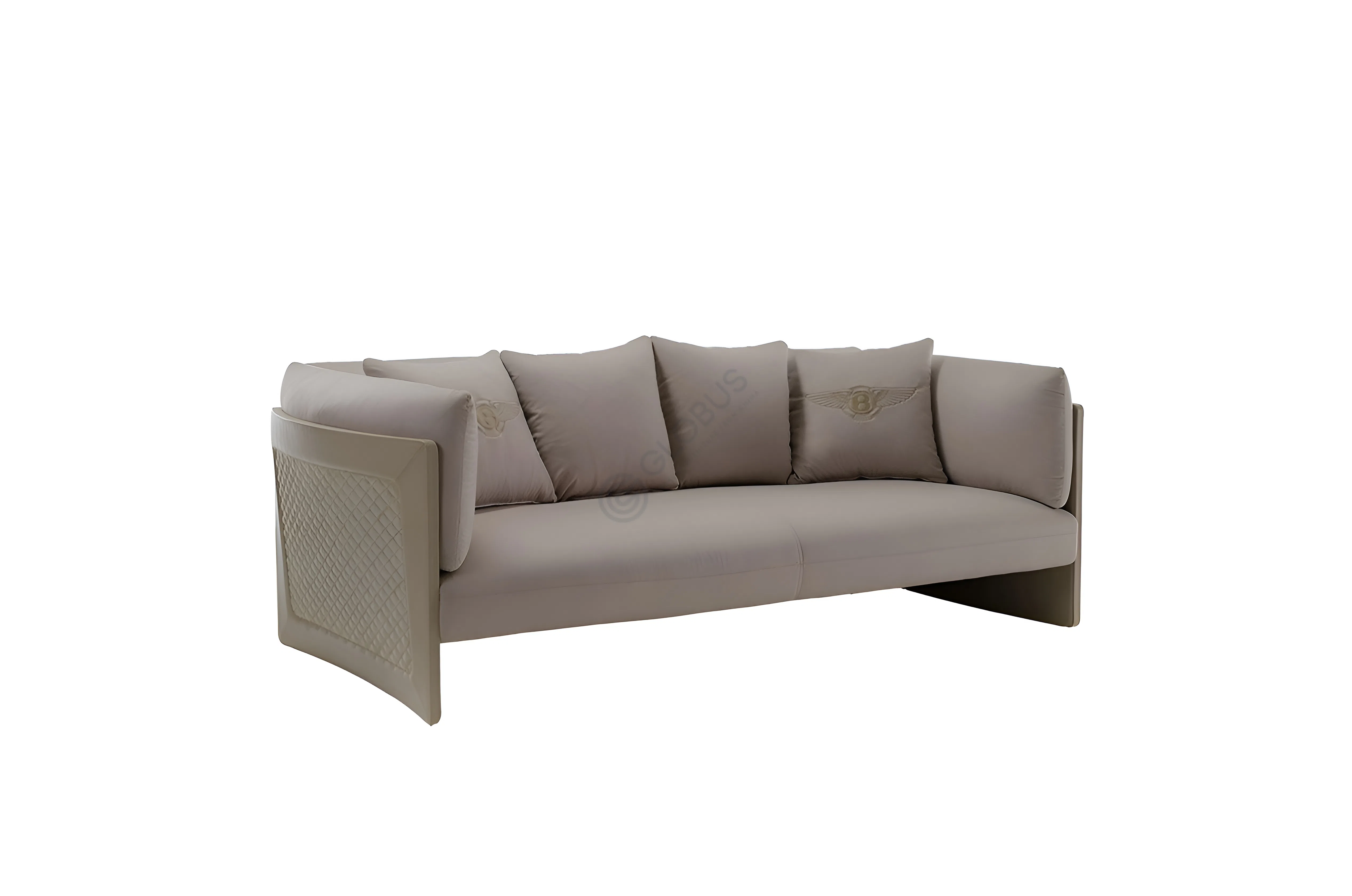 Built for comfort and durability, this armchair features a robust internal structure made from solid wood and plywood, ensuring stability and lasting appeal. The plush microfiber leather upholstery is soft to the touch, providing an enjoyable seating experience. It is accompanied by two generous back cushions, one of which showcases a subtle, elegant embroidered emblem, enhancing the piece's distinctive character.