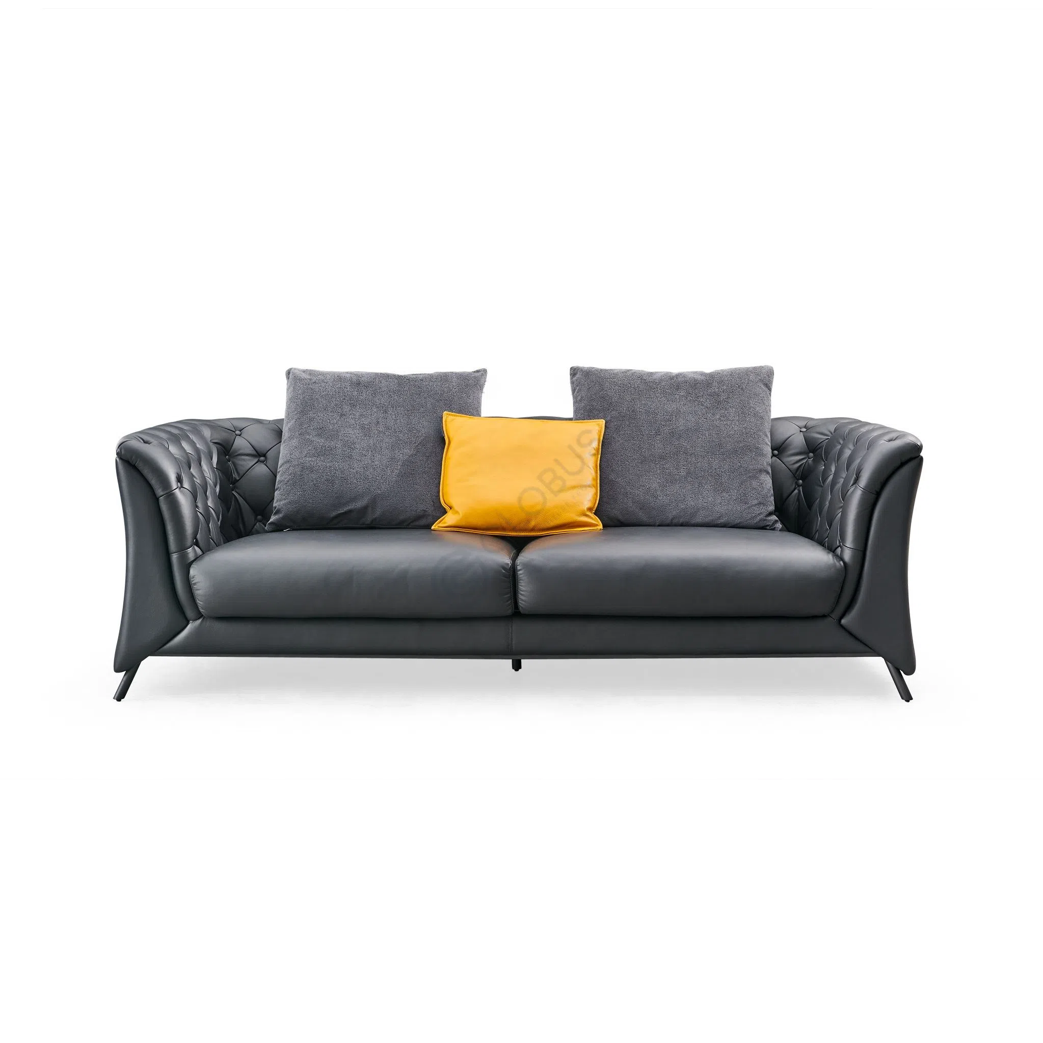 The design features a beautifully curved silhouette with a high backrest adorned with deep button tufting, adding a touch of classic elegance to the otherwise modern form. Sleek, enveloping armrests flow seamlessly into the seat, providing a sense of refined comfort.