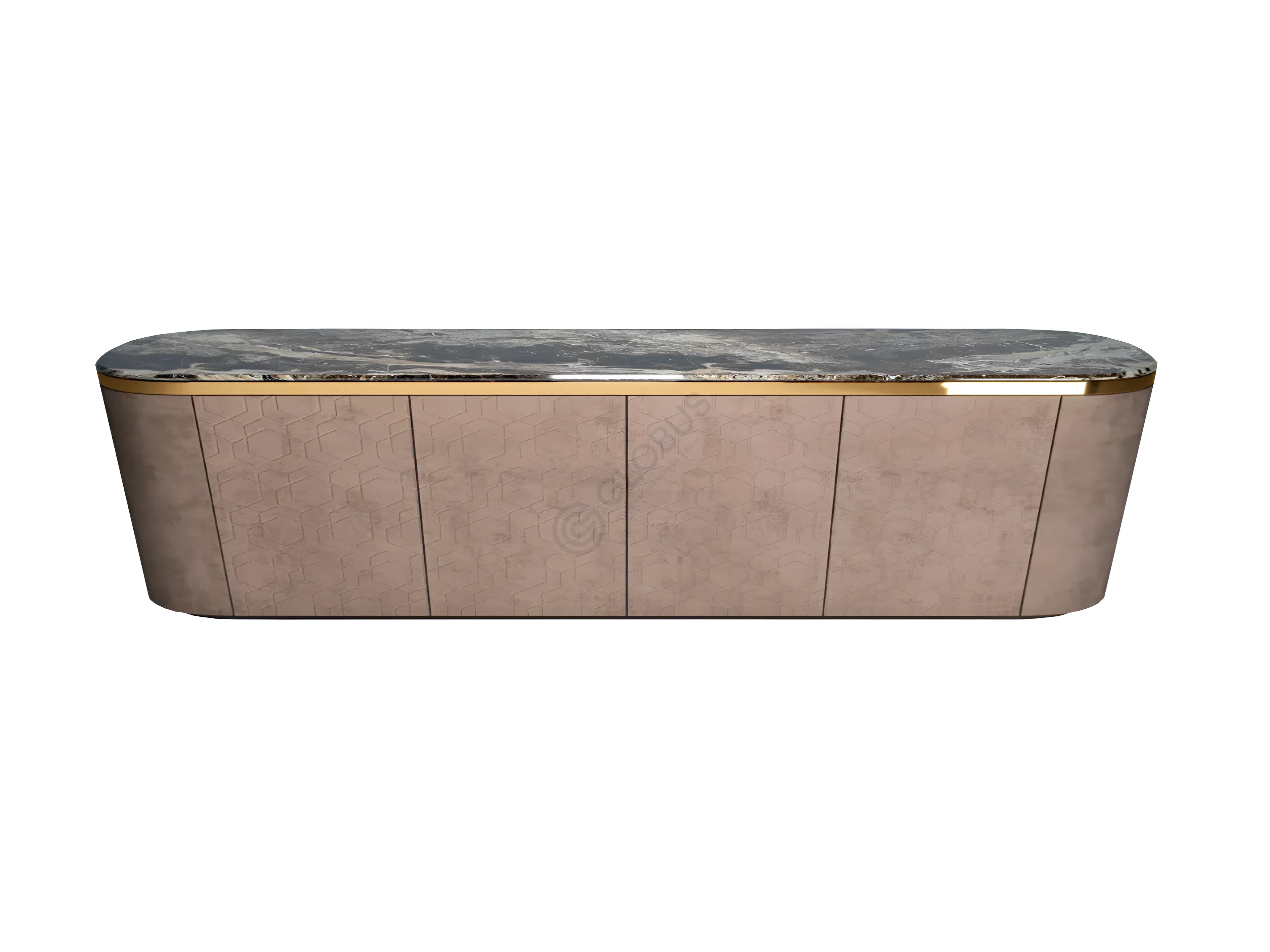 The cabinet is topped with beautiful artificial marble, displaying delicate natural veining, encircled by a lustrous gold-toned stainless steel band. The main body, constructed from durable plywood, is meticulously covered in soft microfiber leather. Across its four doors, a subtle geometric pattern is embossed, adding depth and texture. A slender, gold-toned stainless steel trim gracefully outlines the base, harmonizing with the top accent.