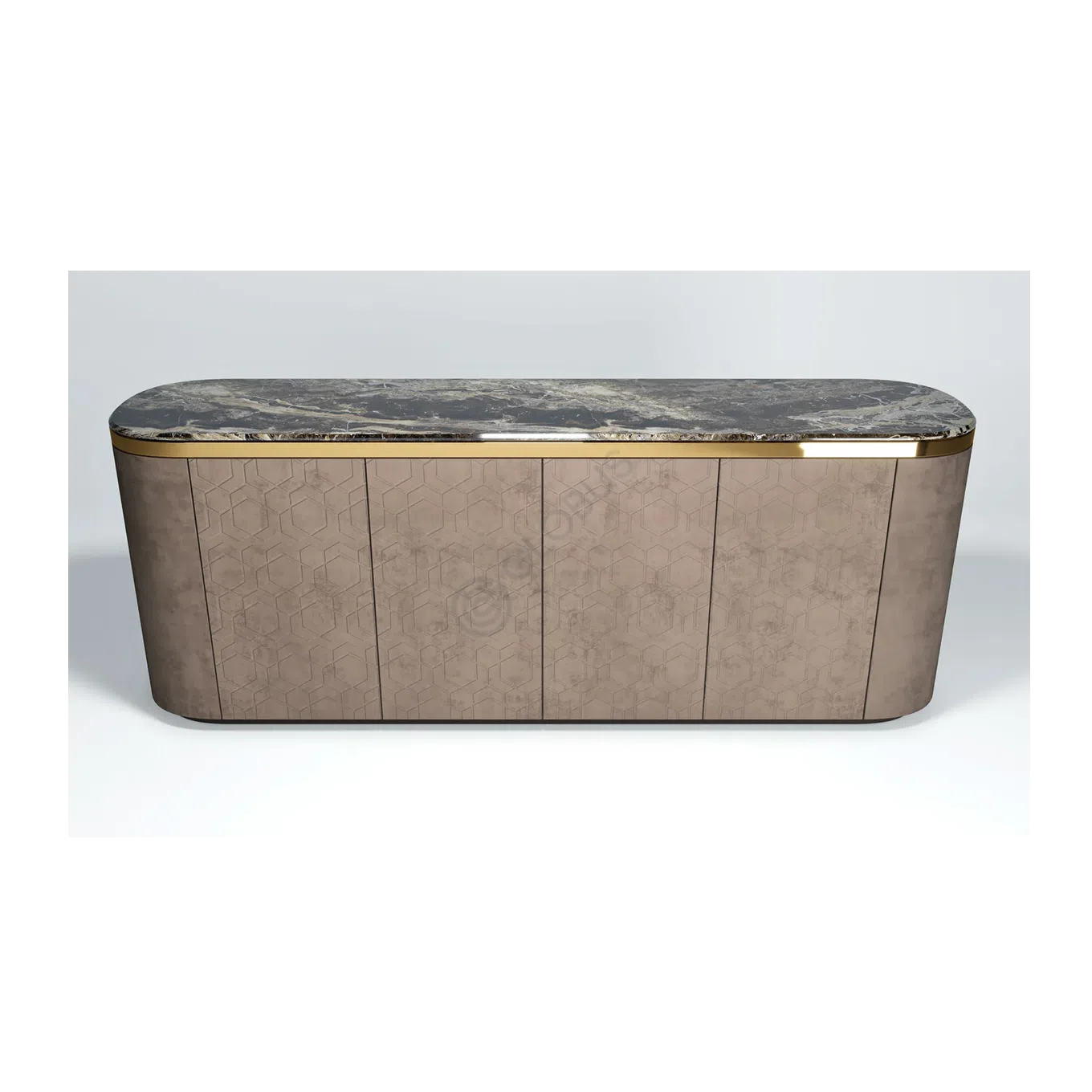 Crafted with attention to detail, the piece combines a sturdy plywood core with luxurious surface materials. The top is finished with artificial marble, providing a durable and visually appealing surface with classic veining. The main body is clad in soft microfiber leather, offering a tactile and sophisticated look, subtly textured with a geometric pattern on the doors. Accents of polished stainless steel add a touch of contemporary gleam, highlighting the edges and frame.