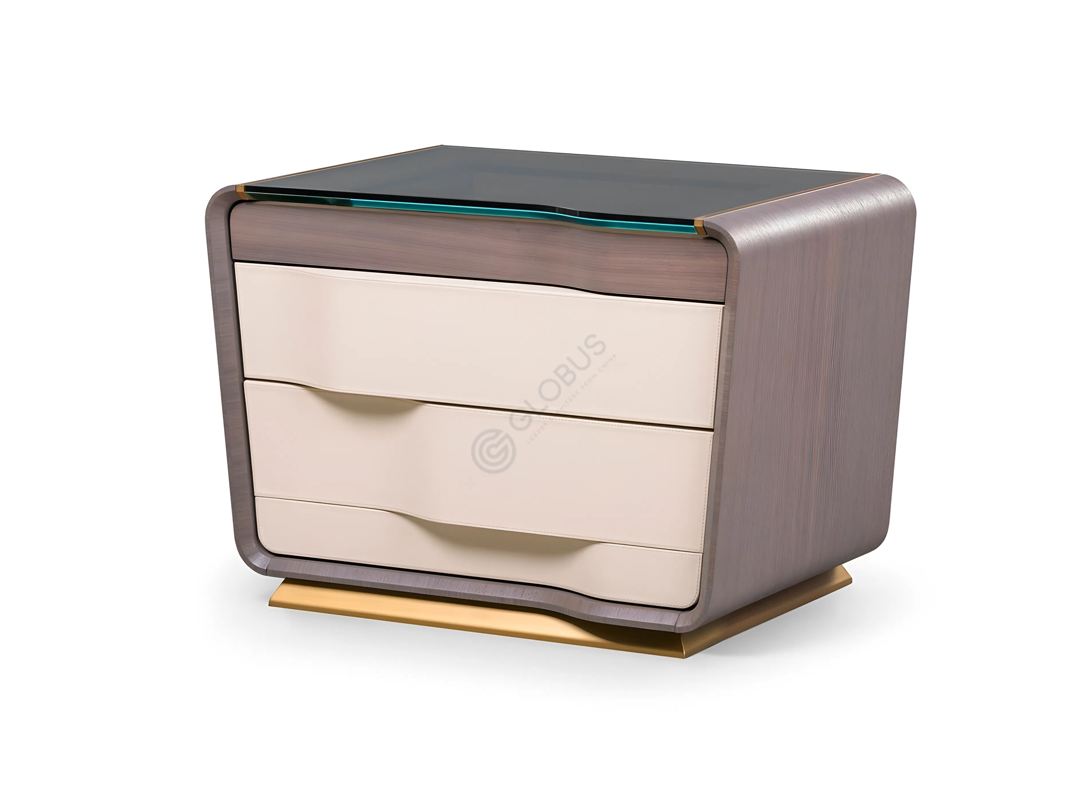 The front features exquisitely finished drawers in a soft, light tone, each subtly contoured to create a flowing, sculptural surface. This design choice contributes to a sleek, handle-less appearance, maintaining an uninterrupted visual flow. The unique top surface, with its subtle raised edge and contrasting accent, adds an additional layer of design interest and practicality.