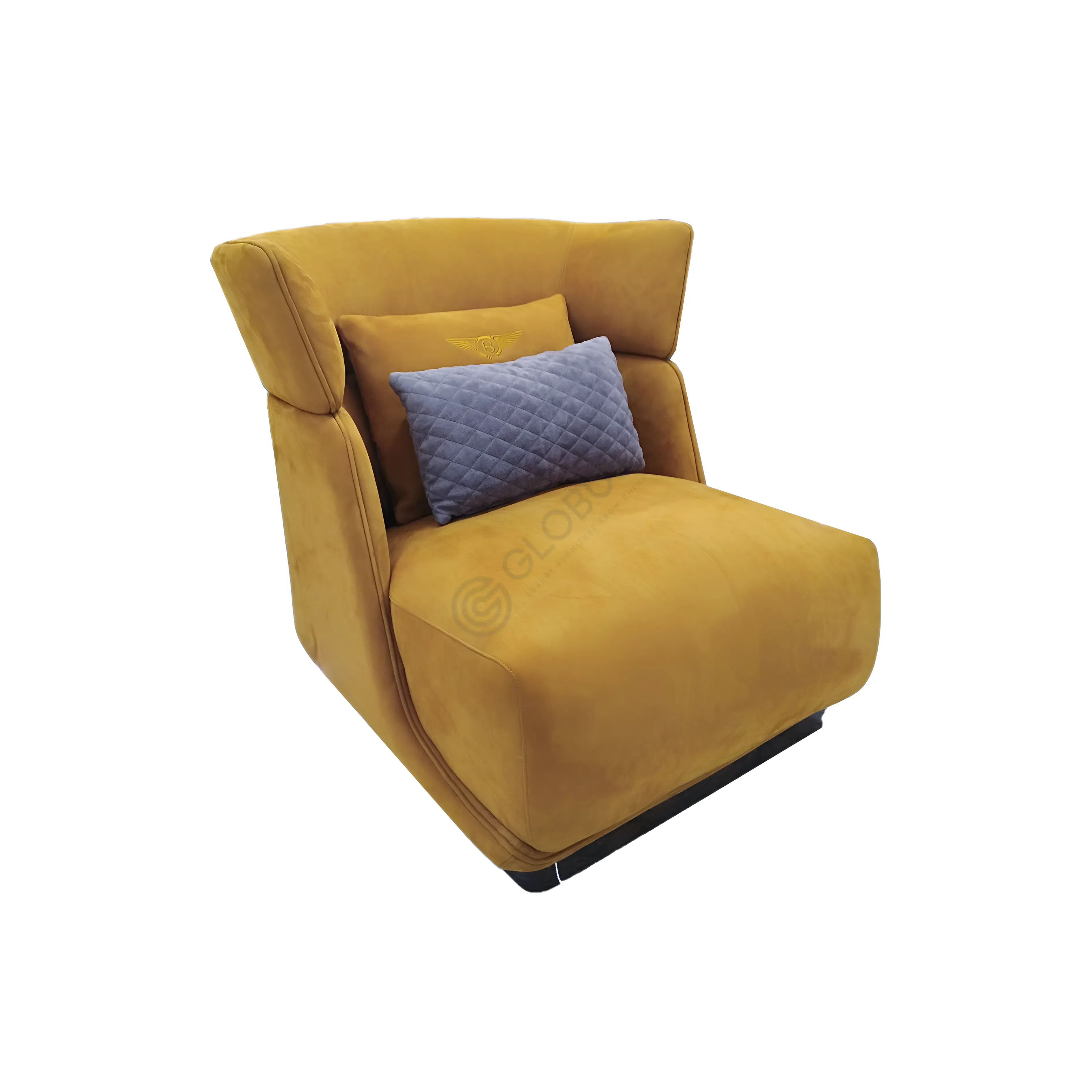 Constructed with a sturdy frame of solid wood and plywood, this piece ensures durability and stability. The generously cushioned seat and three plush back cushions provide exceptional comfort and support, inviting relaxation. Below, a distinct base of solid wood adds a foundational elegance and natural warmth to the contemporary design.