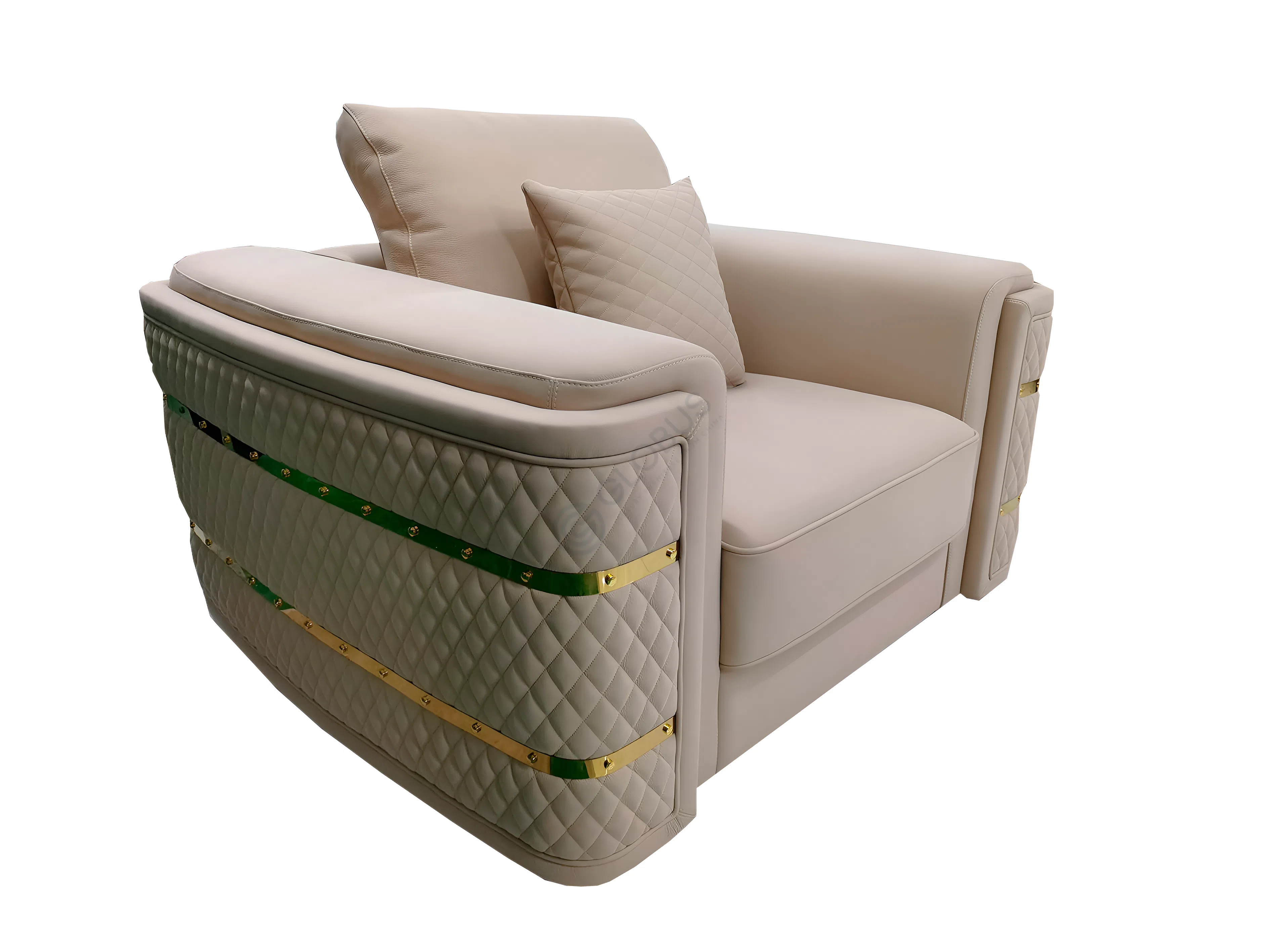 Careful attention to detail is evident in the sofa's design. A subtle brown piping elegantly traces the contours of the seat and back cushions, adding a touch of tailored precision. The armrests showcase a distinctive textured panel on their exterior, highlighted by sleek stainless steel strips in a warm metallic finish. These unique accents lend a sophisticated visual appeal, distinguishing the sofa with understated luxury.