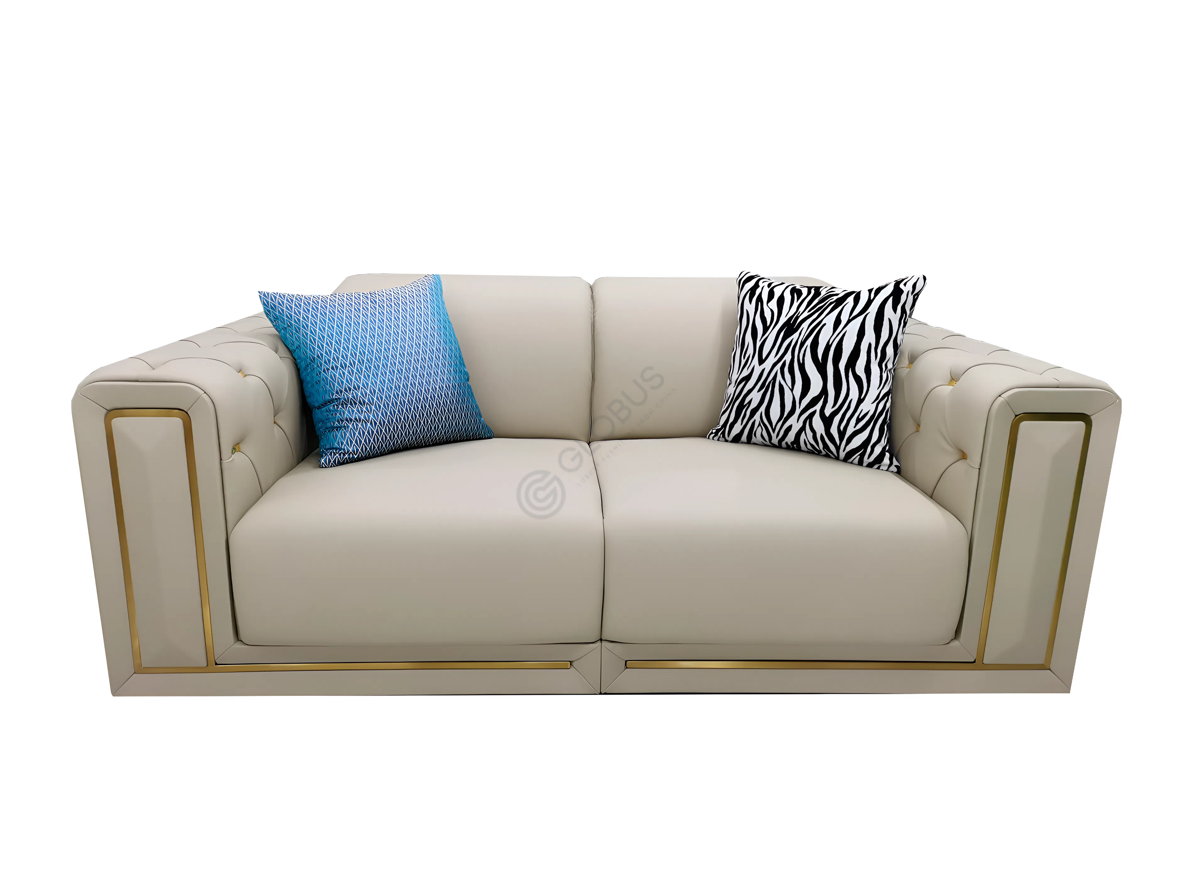 The chair features elegant deep button tufting across its arms and back, adding a rich texture and subtle classic appeal. A distinctive gold-toned stainless steel trim frames the front of the armrests and runs along the base, emphasizing the armchair's sleek profile and introducing a luxurious, metallic accent. A smooth, generously cushioned seat provides comfort, complementing the detailed upholstery.