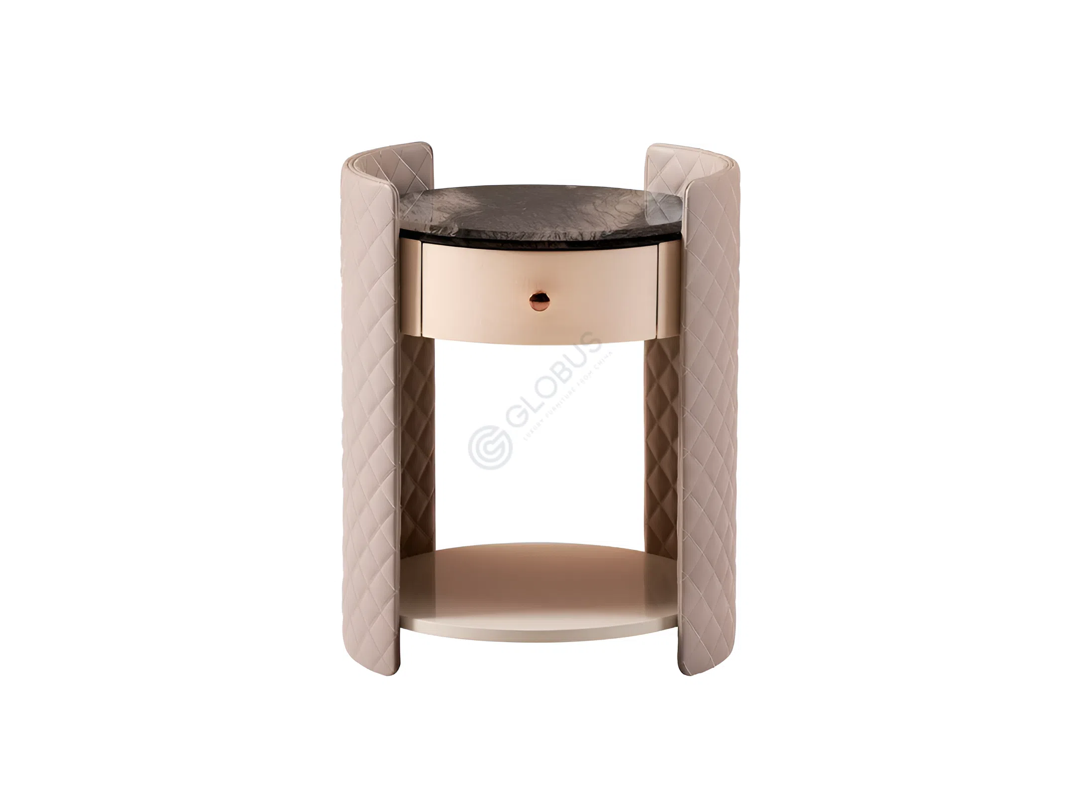 The table's curved body is expertly wrapped in quilted microfiber leather, adding a rich texture and sophisticated touch. Seamlessly integrated, two drawers with understated gold pulls offer convenient storage, while an open shelf below provides additional space for display or accessibility. The robust plywood structure ensures stability and enduring appeal.