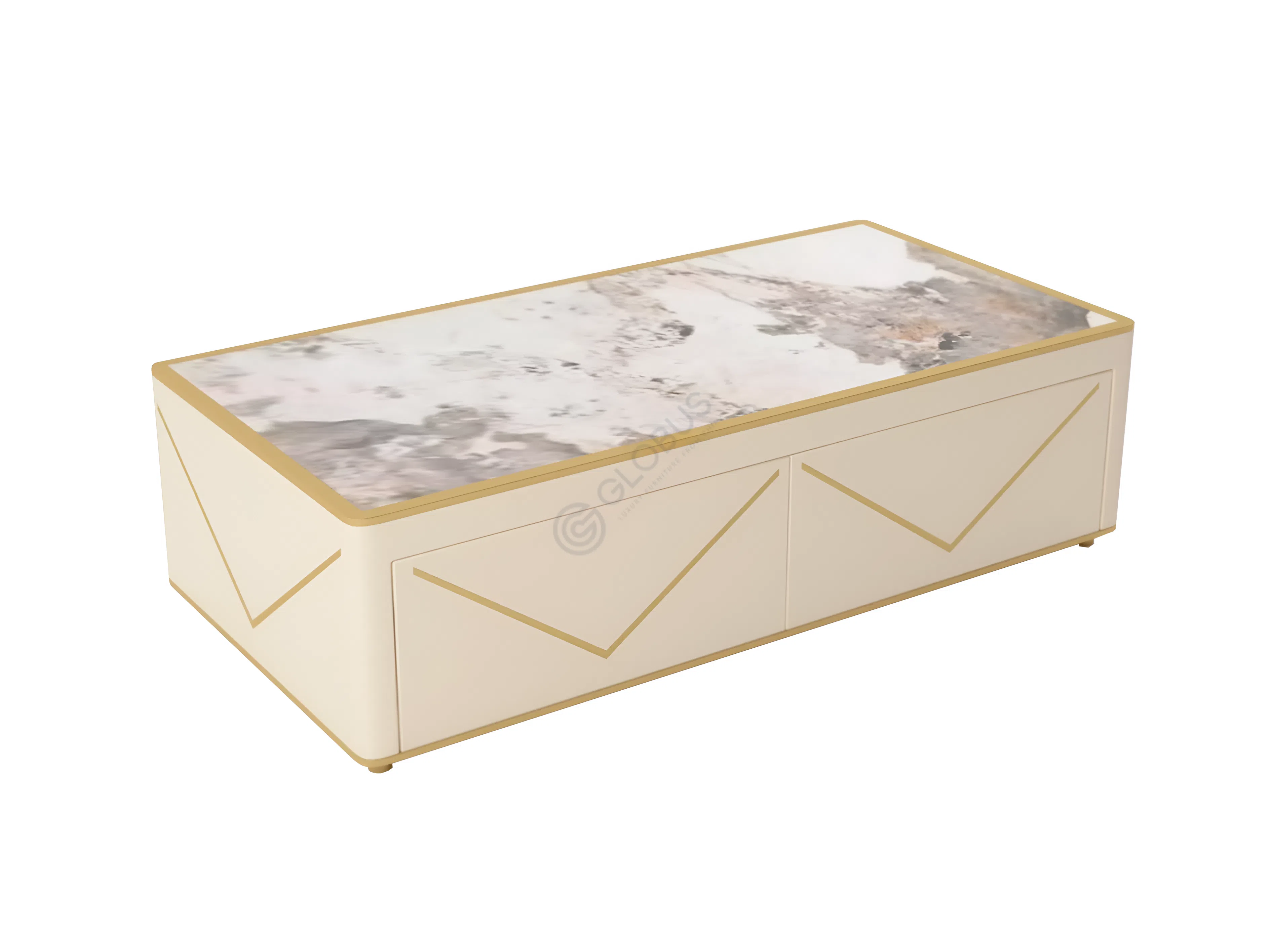 Crafted with an eye for detail, the table features a durable sintered stone top, showcasing a delicate veined pattern that exudes natural beauty. This surface is elegantly framed by a lustrous stainless steel trim, which complements the table's luxurious aesthetic. The sides are meticulously upholstered in high-quality microfiber leather, providing a soft texture and adding a layer of visual warmth. Beneath these premium finishes, a solid wood core ensures lasting stability.
