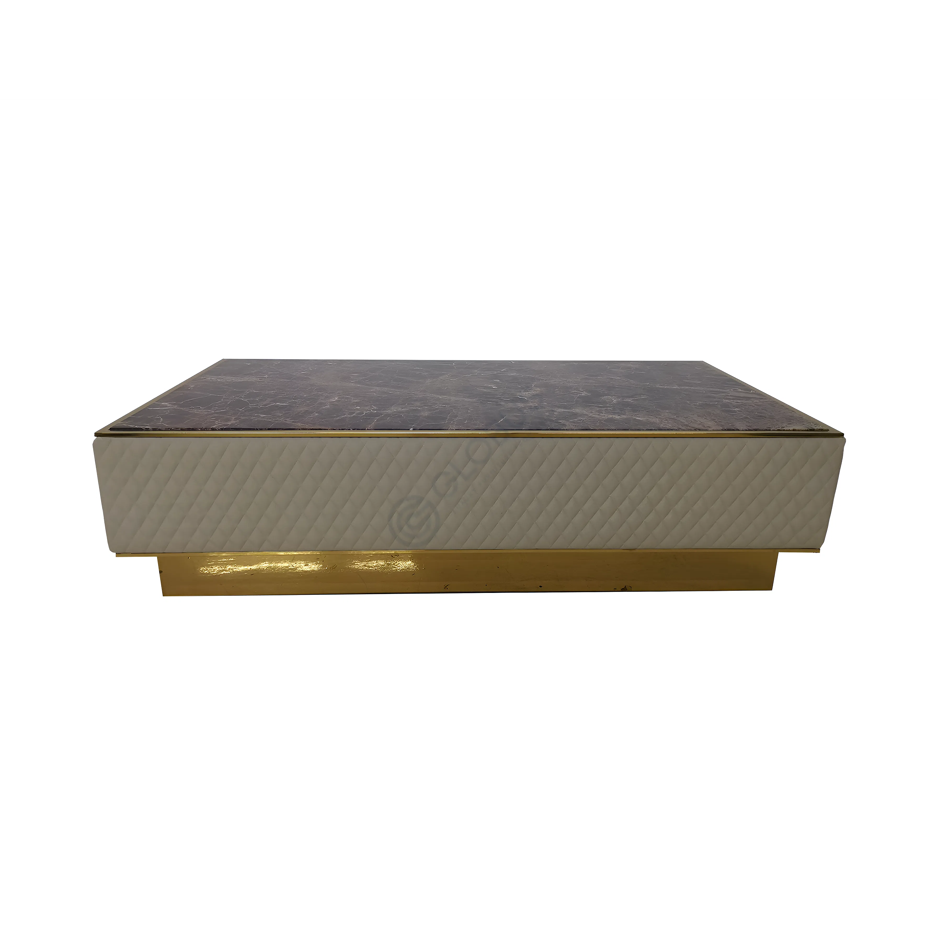 The body of the table is gracefully upholstered in a soft textile, detailed with a sophisticated quilted pattern that introduces a tactile quality and inviting texture. A sleek band of stainless steel, finished in a warm metallic tone, elegantly frames the marble top and is subtly echoed in the base, creating a cohesive and polished foundation for the piece.