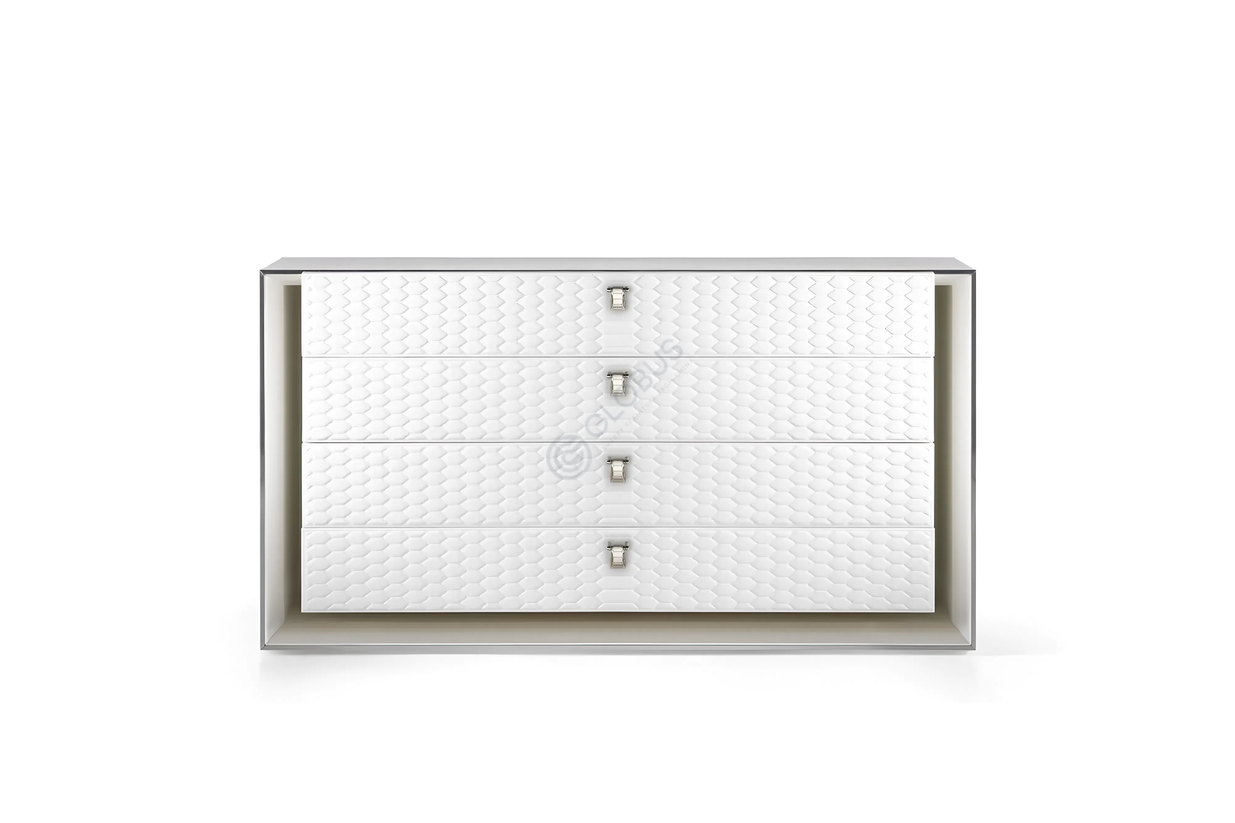 Crafted with a sturdy plywood core, this piece features drawer fronts adorned with luxurious microfiber leather. The distinctive hexagonal textured pattern on each drawer provides a unique tactile and visual depth, making it a standout feature. Sleek stainless steel handles complete the drawers, adding a touch of polished modernity, while similar accents define its elegant base.