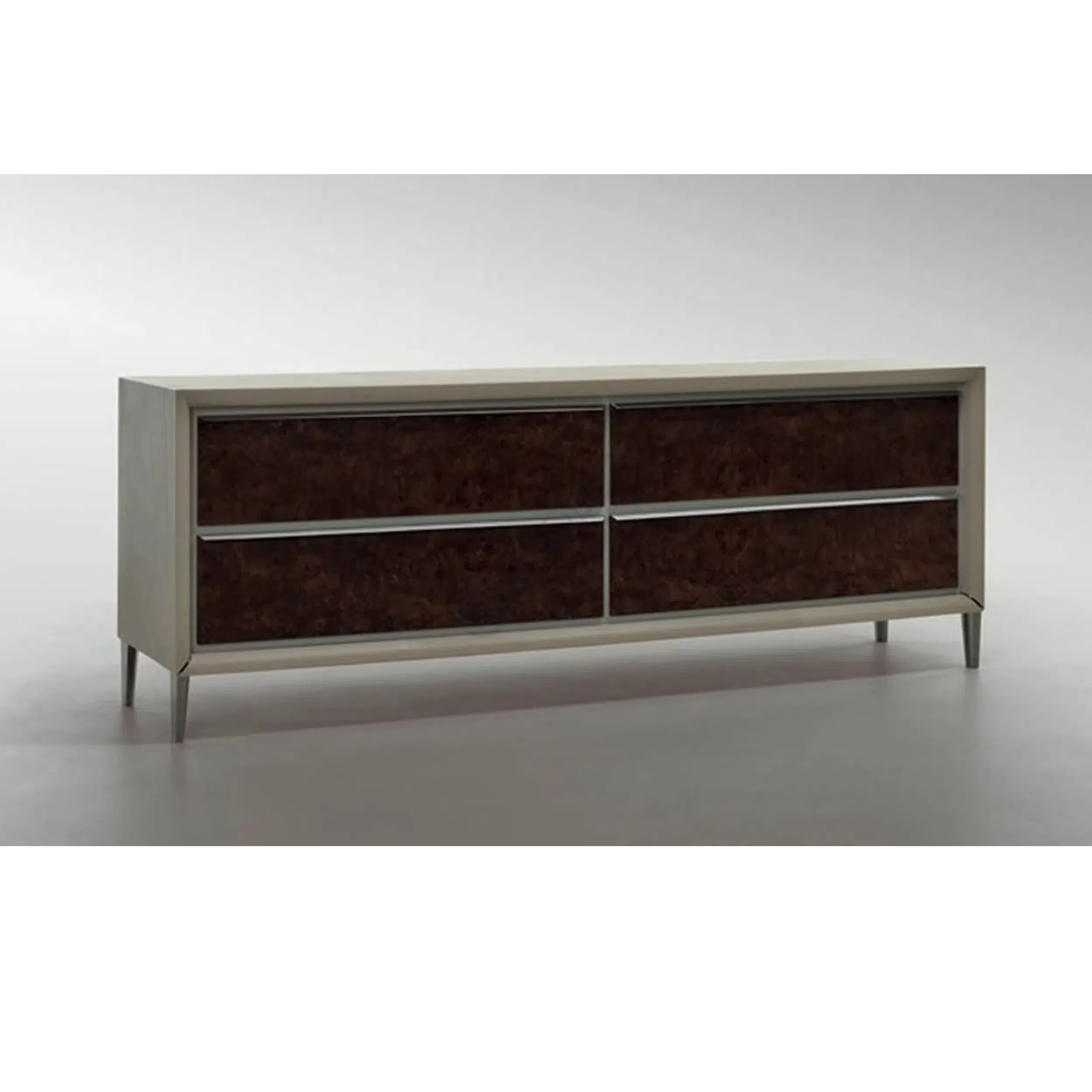 Crafted with a combination of premium materials, the frame is likely constructed from durable plywood and finished with soft microfiber leather, providing a luxurious tactile experience. The doors feature a distinctive rich, patterned surface, accented by sleek metal handles or trims, creating a beautiful contrast against the lighter frame. This considered mix of textures and finishes elevates the piece.