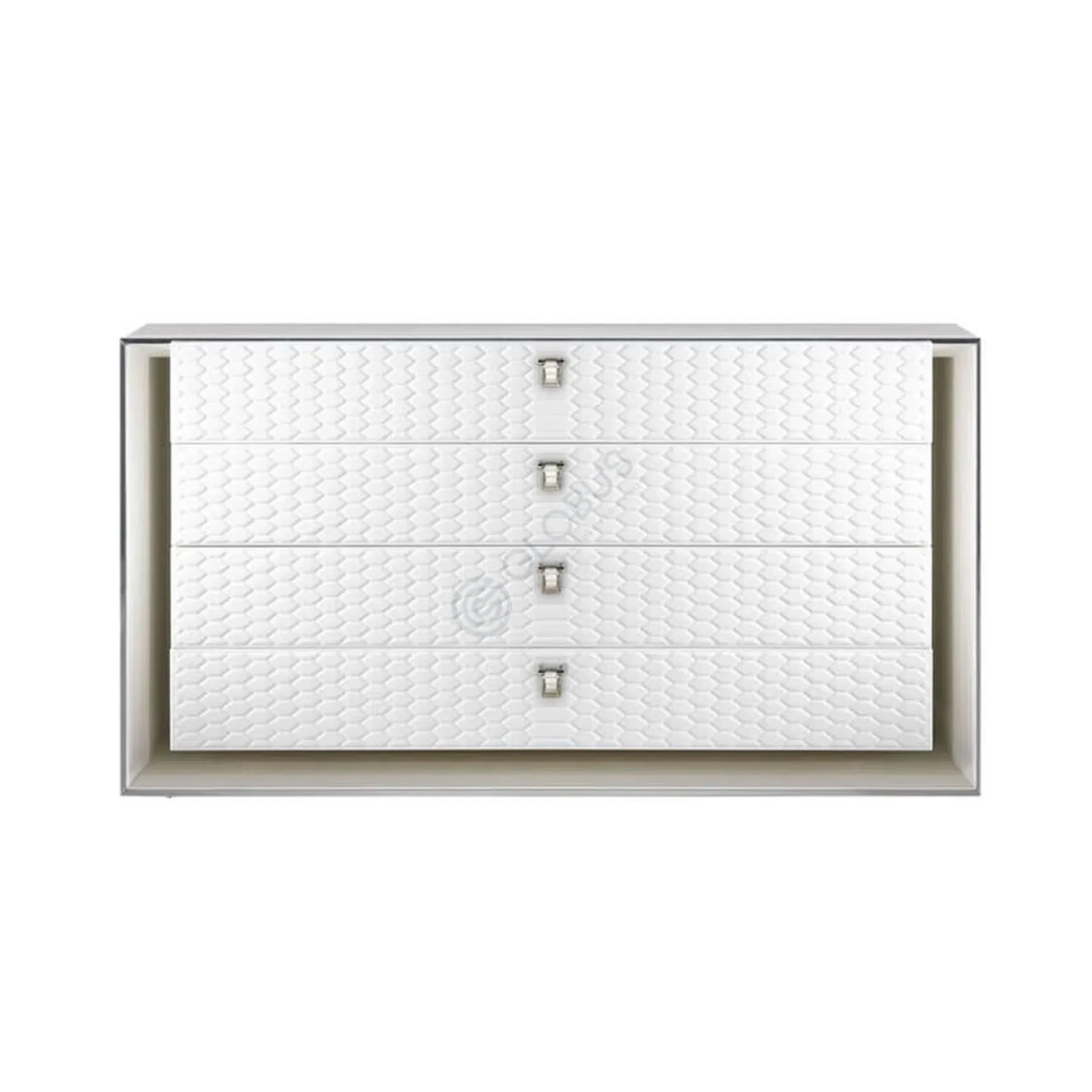 This piece serves as a functional and stylish companion, perfectly blending beautiful textures and finishes to complete a refined modern bedroom setting.