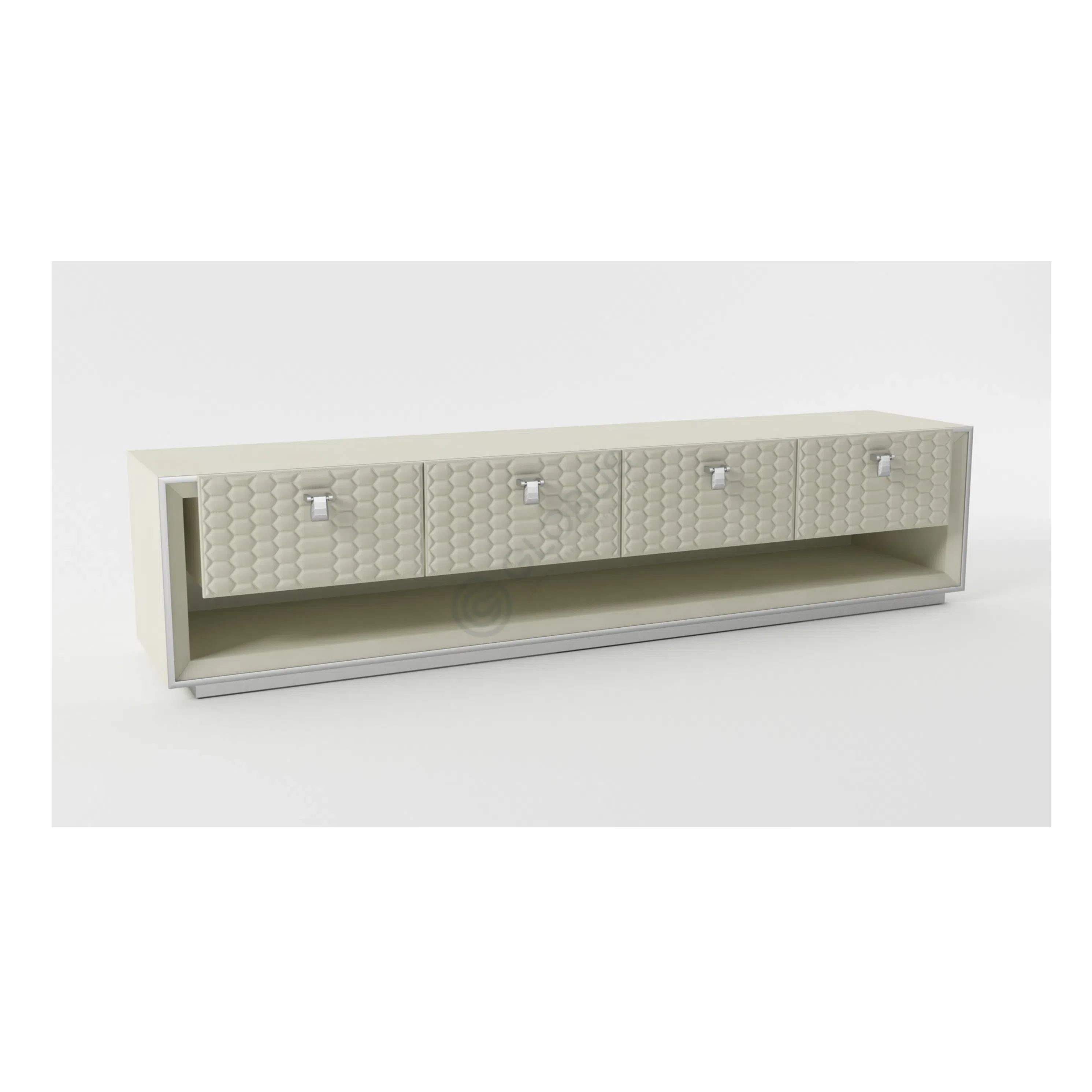 Crafted with quality materials, the body utilizes sturdy plywood finished in a calming tone. The drawer face is a focal point, upholstered in luxurious microfiber leather featuring a distinct honeycomb pattern. Polished metal accents frame the piece, adding a subtle gleam that enhances its contemporary design.