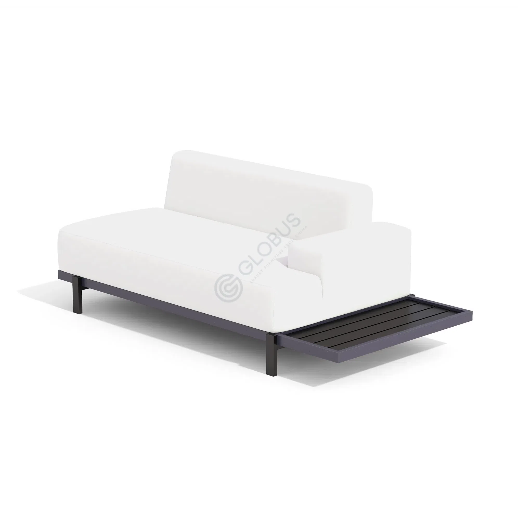 The structure features a sturdy frame crafted from metal and aluminum, providing a durable base for use in various environments. A comfortable textile cushion forms the main seating area, offering a soft counterpoint to the minimalist frame. A distinctive element is the integrated side tray made from solid wood, offering a convenient surface for drinks or essentials right at your fingertips.