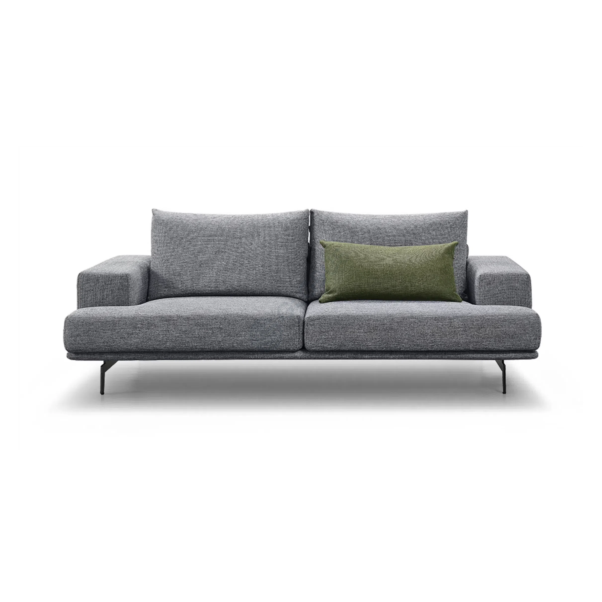 Crafted with a sturdy solid wood frame and supported by elegant steel legs, this sofa provides lasting durability. The deep seating and back cushions are generously filled with feather for exceptional comfort, while the fine textile upholstery adds a soft touch and refined texture.