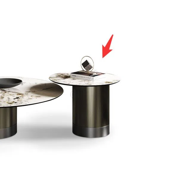 The coffee table features a striking round top crafted from sintered stone. This surface displays a natural stone-like pattern with captivating variations in color and veining, providing unique depth and visual interest. A clear glass layer appears integrated with the stone, lending a smooth, reflective finish that enhances the inherent beauty of the material.