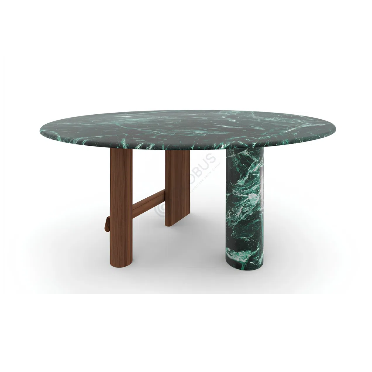 Crafted from a combination of solid wood and MDF, the table features a round top with a rich, natural wood grain. This top rests gracefully upon a contrasting vertical wooden support. Below, a vibrant red cylindrical base adds a bold touch of color and a sleek, contemporary feel, creating an appealing interplay of textures and forms.