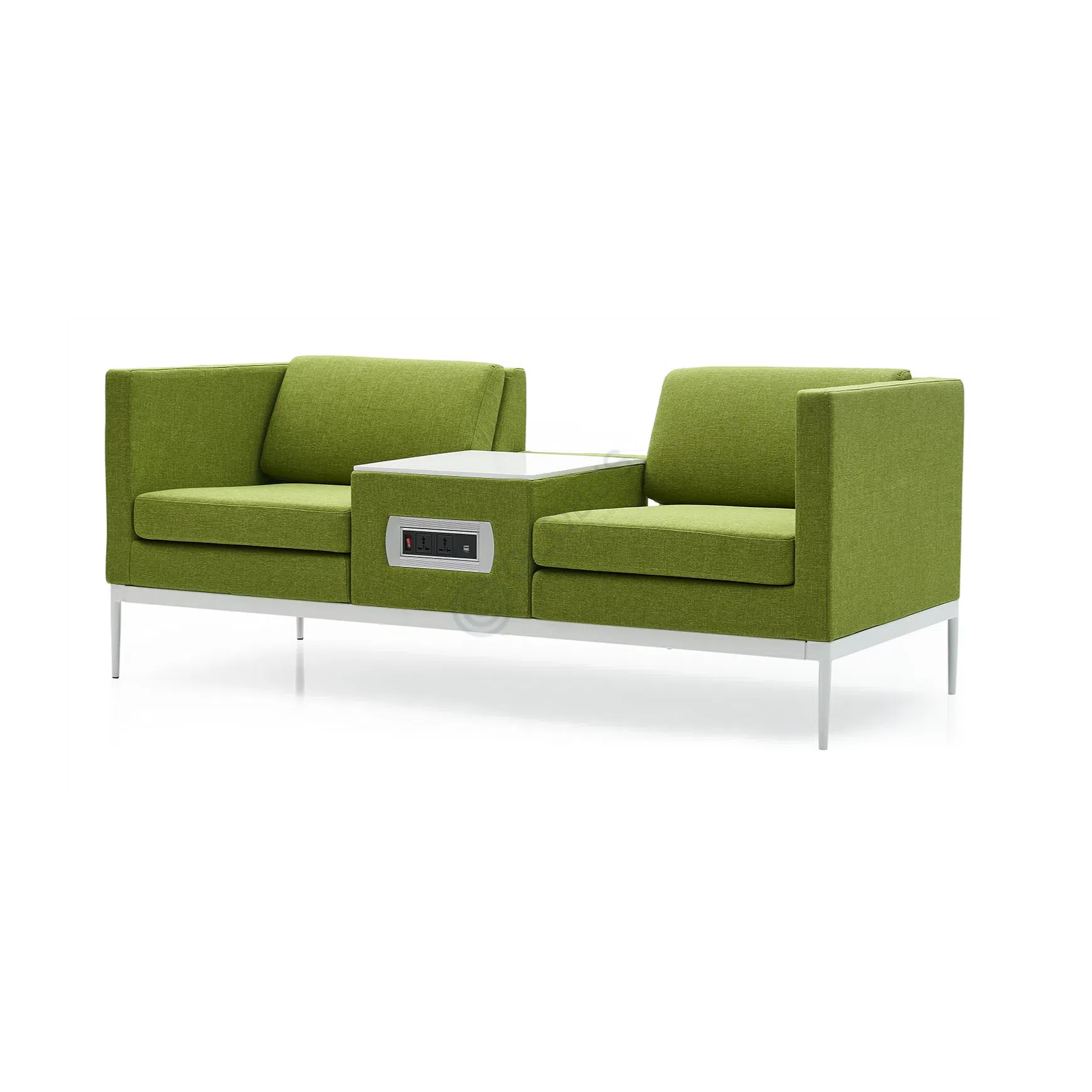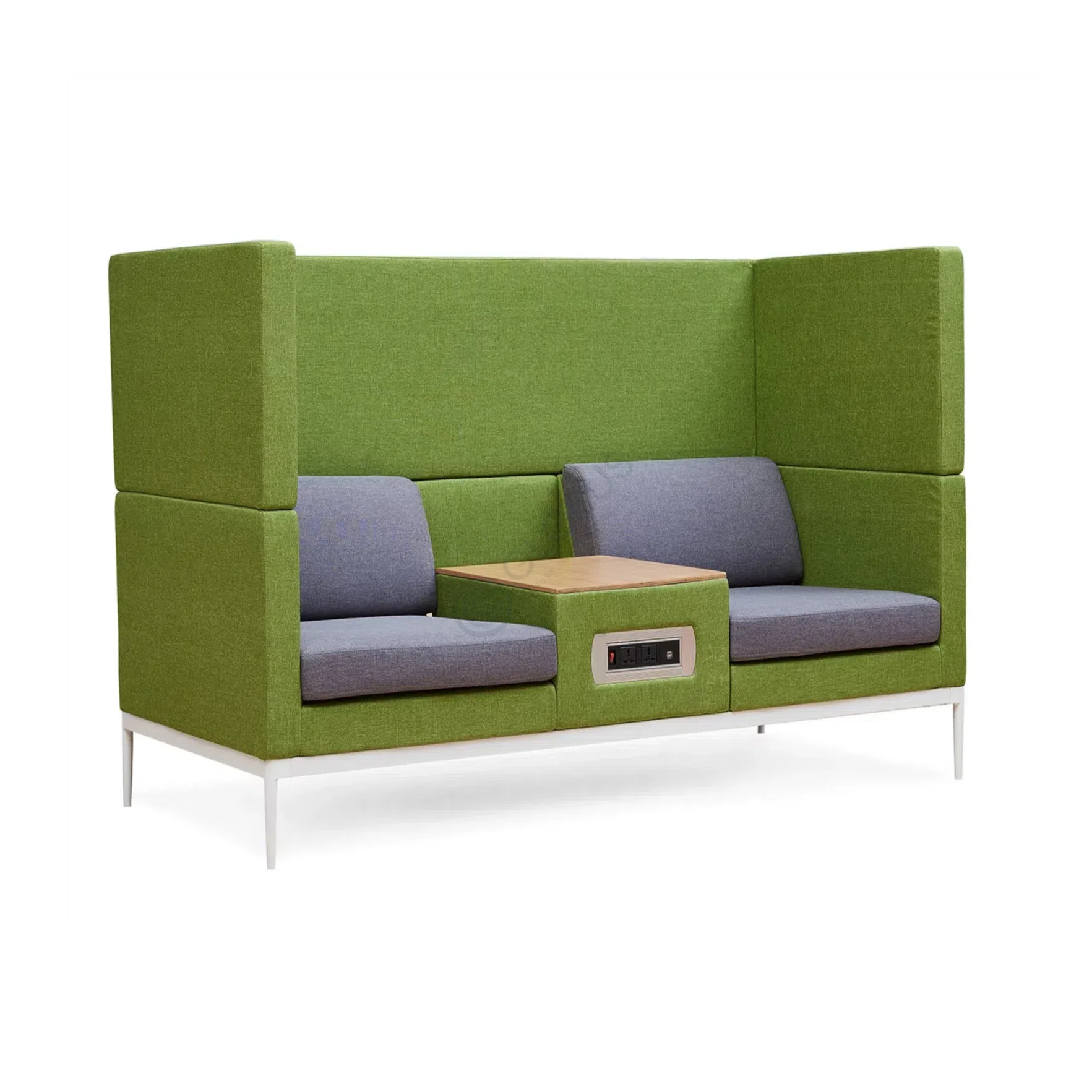 This straight sofa presents a modern design, featuring a distinctive high back and side panels in a vibrant green textile. The seating area is upholstered in a complementary light grey fabric, offering a clean and inviting appearance. Its streamlined silhouette is supported by slender steel legs, contributing to an airy and contemporary feel.