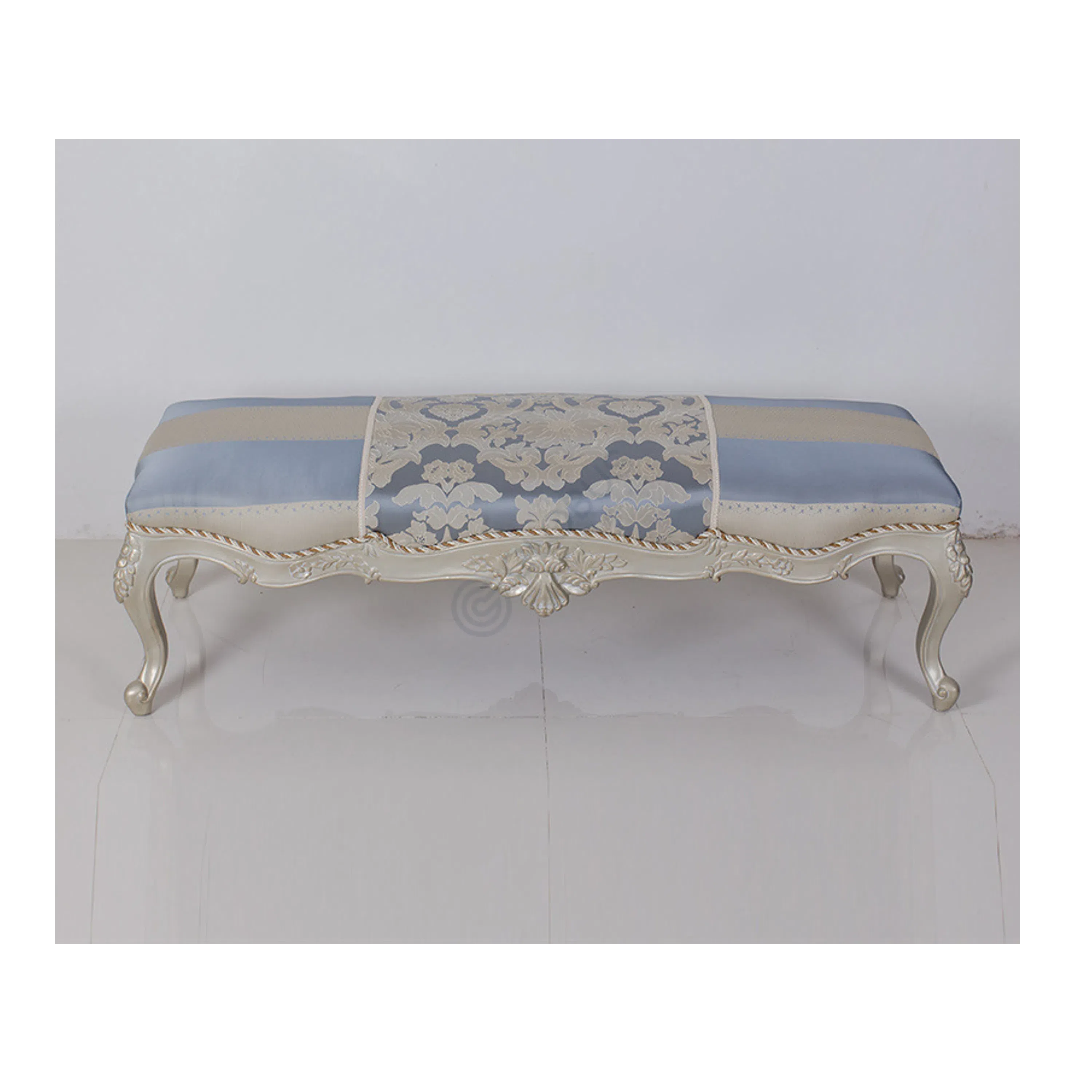 This elegant stool presents a refined silhouette, crafted from solid wood featuring intricate carvings that speak to classic design sensibilities. The curved legs and decorative frame provide a foundation of understated luxury, showcasing skilled craftsmanship. Its upholstered seat offers comfort, adorned with a subtle textile pattern that complements the wooden structure beautifully.